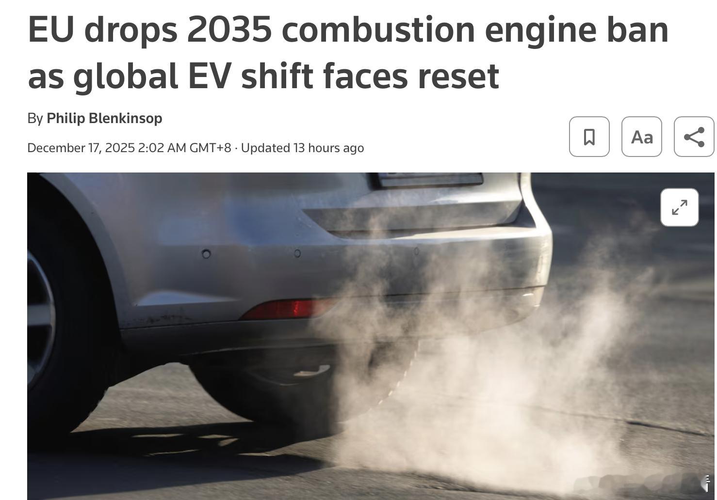 欧盟反悔了!撤回2035年燃油车禁令当地时间12月16日,欧盟委员会正式宣布,撤回原计划2035年起全面禁售燃油新车的政策。按照新提案,车企只需在2035年前,将新车平均二氧化碳排放量较2021年水平削减90%,而非此前要求的“100%零排放”。欧盟在一份新闻稿中表示,剩余10%的排放量“需通过使用欧盟本土生产的低碳钢材,或是采用电子燃料与生物燃料来抵消”。这一调整意味着,搭载内燃机的各类车型(包括传统汽油车、柴油车、轻混动力车、油电混合动力车、插电式混合动力车以及增程式电动车)在 2035 年之后将继续保有市场空间。欧盟此次政策调整主要是因为电动汽车普及速度远未达预期。报道称,大众集团、Stellantis等在内的欧洲车企,以及欧洲汽车制造商协会(ACEA)均认为原定目标过于激进,并敦促放宽排放要求、降低对未达标企业的处罚力度。不过,放缓禁燃油车政策在欧盟内部也引发明显争议,他们认为此举可能导致电动化投资放缓。此前,沃尔沃和极星就曾公开呼吁欧盟维持禁令原计划,并表示放宽禁令的做法是一种“掩盖本国产业裂痕的绝望尝试”。值得注意的是,此次修订后的规则虽已获得欧盟多个主要成员国的支持,但仍需经过欧洲议会的正式批准才能生效。汽场全开汽车 (原创/欢欢)
