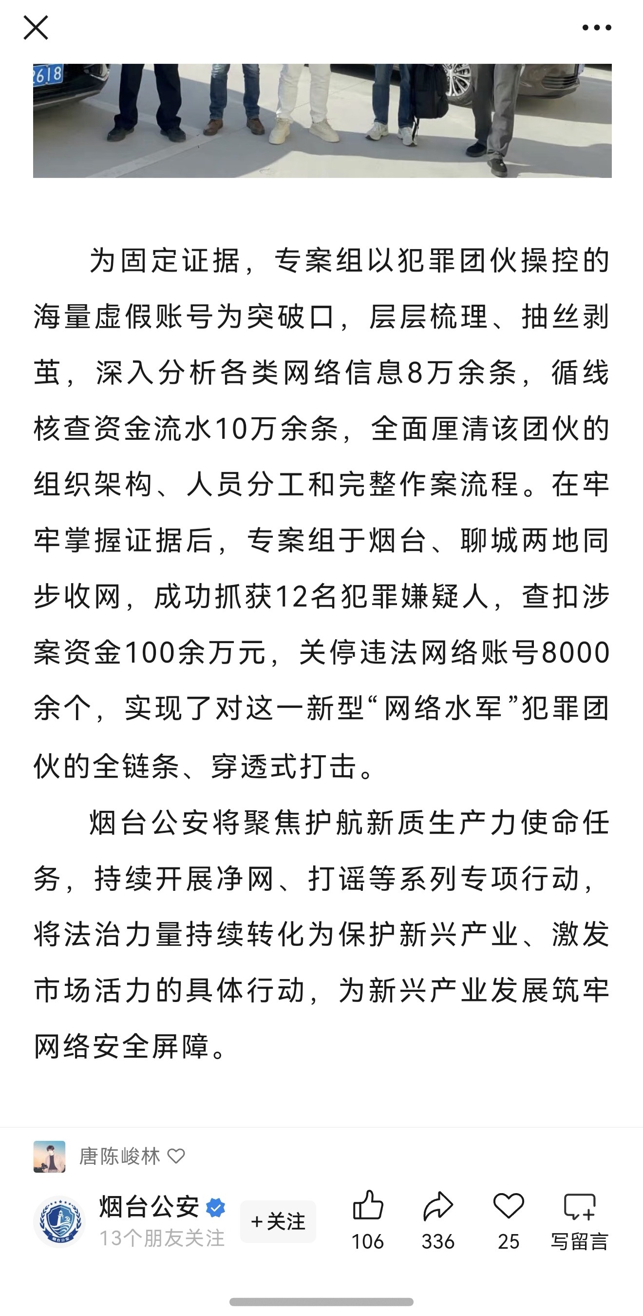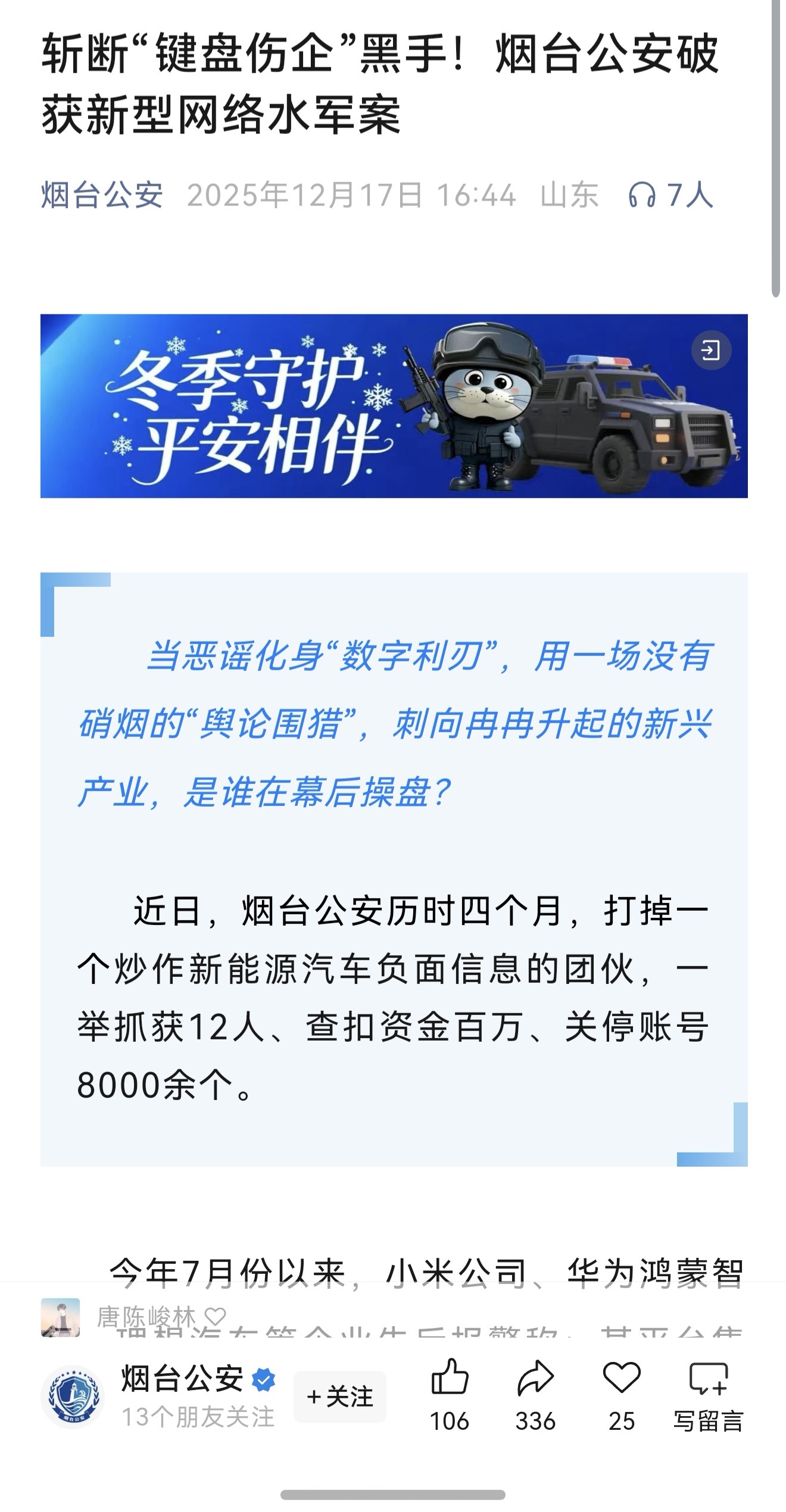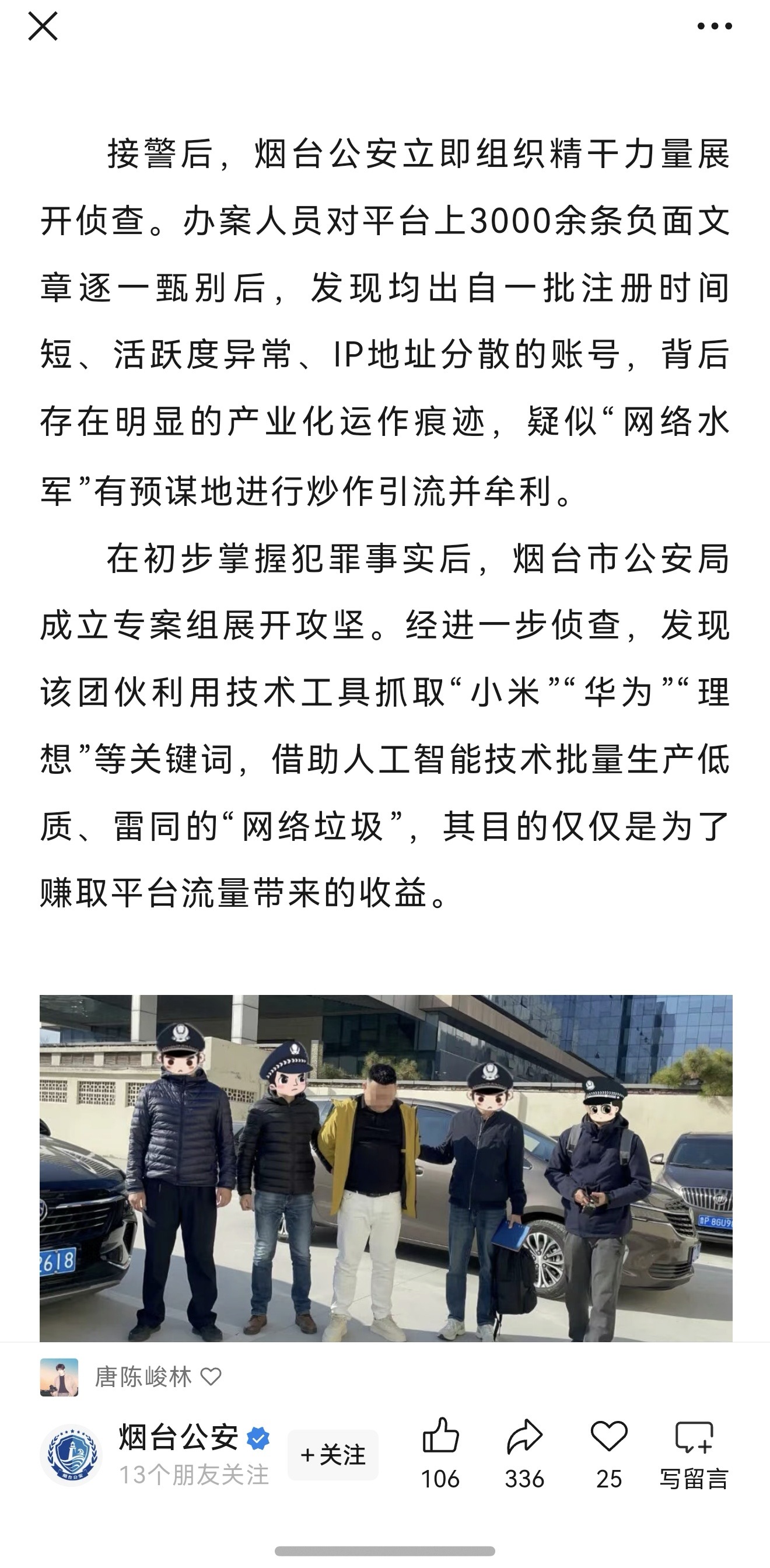 黑产操纵8000余个账号抹黑小米华为理想 小米操作真是快准狠!最早报警之后,警方顺着线索追查,竟然发现有团伙用AI批量生成黑稿,短时间内就冒出三千多条负面内容。结果烟台公安直接来了个全链条打击,端掉了水军老巢,一口气关停八千多个黑账号,查扣上百万涉案资金。不得不说这招“报案杀”,直接让八千水军账号蒸发。配合警方重拳出击,既给自家清了网络环境,也算给行业提了个醒,靠黑稿引流赚黑钱,真得小心帽子叔叔顺着网线找来!