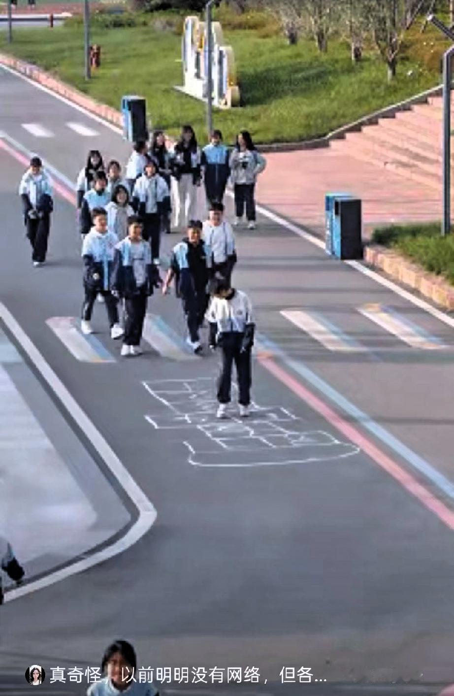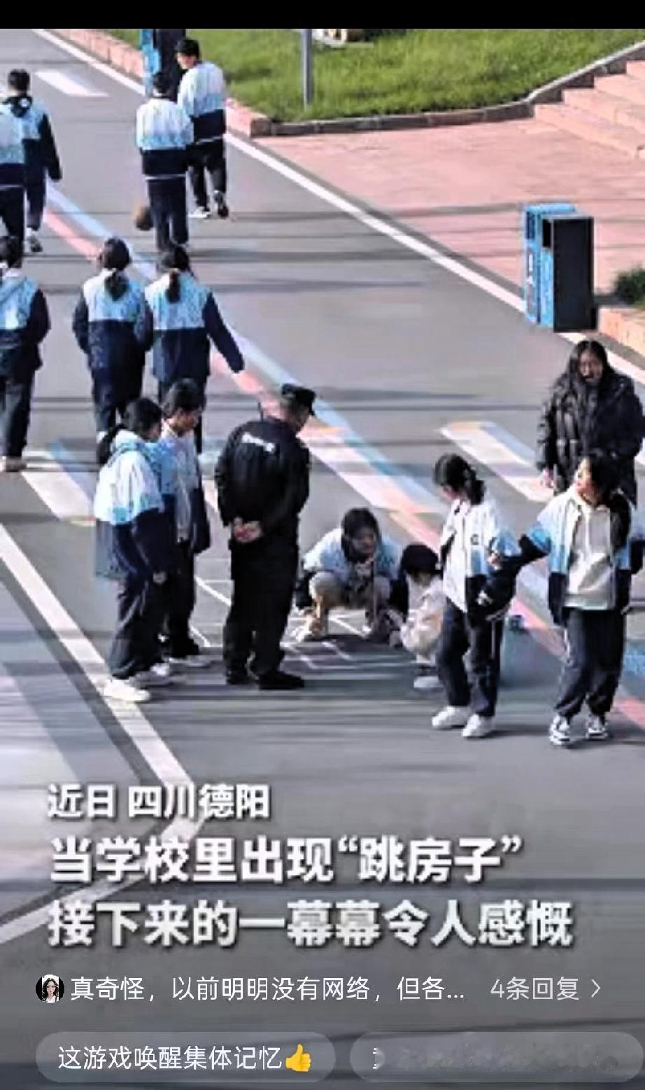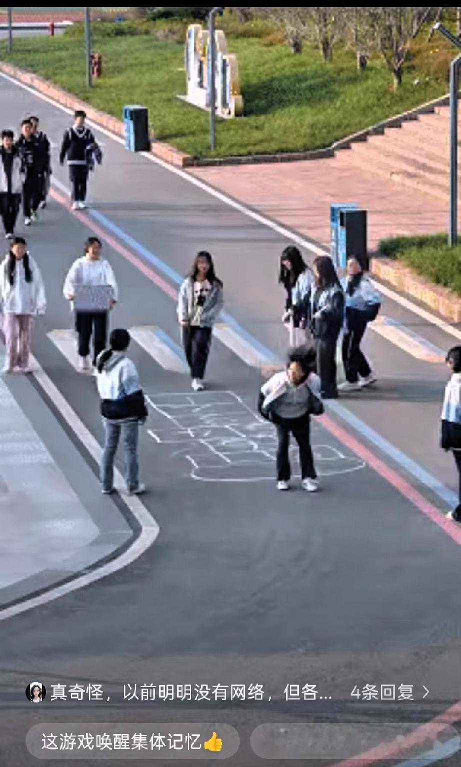 “解释不清了!四川德阳两名高中女生课间在路边用粉笔画的跳房子,意外勾起了一群人的集体回忆。 本是孩子们随手的小创作,却成了一条时光纽带。路过的割草工人瞥见地上的格子,脚步顿了顿,犹豫几秒还是匆匆走开,大概是手头的活计不允许他多停留。 下课铃一响,学生们呼啦啦围过来,有男生直接抬脚开跳,单脚双脚切换得干脆利落,旁边的同学凑在一起指点,上课铃响后,大家又一窝蜂地散去。 最让人动容的是巡逻的保安大叔,他四下张望确认没人注意,才小心翼翼地跳进格子,动作有些僵硬却格外认真,跳完后悄悄拍了拍裤腿,嘴角带着藏不住的笑意。 几位路过的老师也忍不住加入,她们跳得很慢,每落一步都像在回味什么,跳到最后一格时,眼神里满是怅然。 一块空地、几根粉笔、一颗石子,曾是我们童年最常见的消遣。那时候没有刷不完的短视频,没有打不完的手游,几个小伙伴凑在一起,就能从午后玩到夕阳西下,哪怕因为踩到线争得面红耳赤,转头又能笑着和好。 现在的孩子习惯了电子产品的陪伴,很难体会到这种简单的快乐;而我们这些成年人,却总在某个不经意的瞬间,被这样的画面击中内心最柔软的地方。 我们怀念的从来不是跳房子本身,而是那个不用赶作业、不用愁工作、只管疯玩的自己。 小时候总盼着快点长大,以为成年后能拥有更多自由,长大后才发现,最无忧无虑的时光,早就被我们甩在了身后。那些画在地上的格子会被冲刷掉,可藏在格子里的童年,却永远刻在心底。