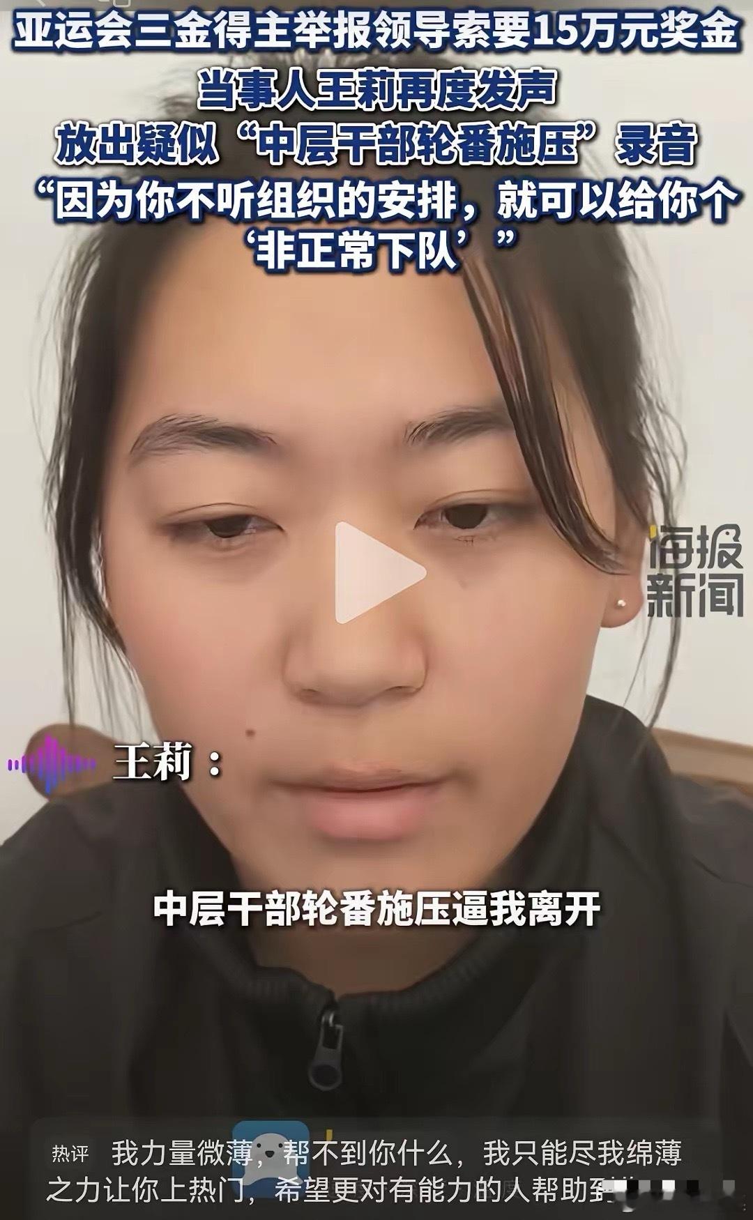 “三金得主”王莉再发声:不敢呆在家中,在朋友家暂住。有多地警方与她联系。事已至此,无所顾虑了,只能硬刚到底!若不是被逼无奈,谁会走到这一步?!大家都想想,为什么不敢呆在家了?要避起来?那是她觉得不安全了!!基地还报警说她失踪??可笑!一定要保护好自己,支持王莉!!严查训练基地!!(配图来源于网络视频截图)
