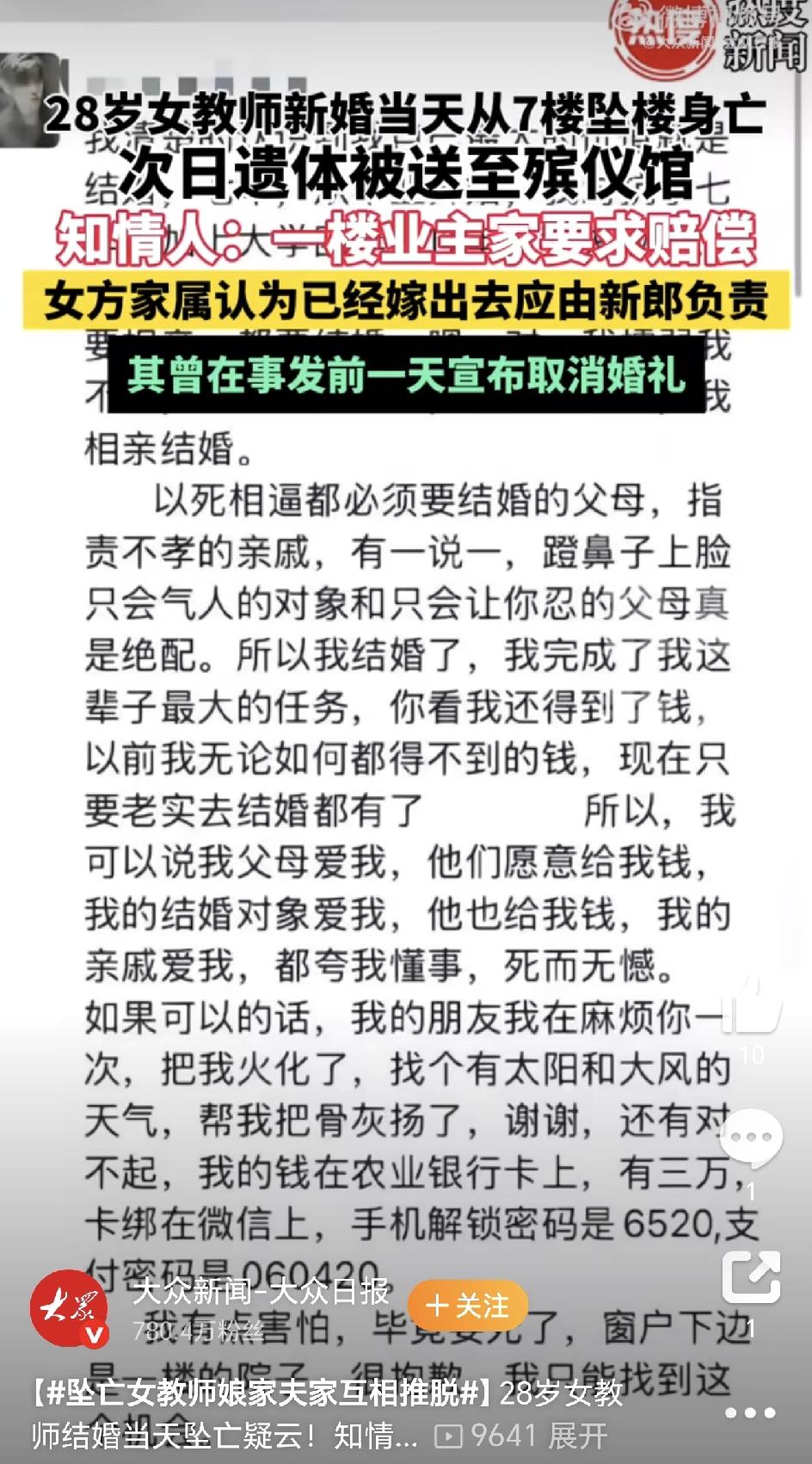 关于女教师新婚当天跳楼的事件,最无辜的当属一楼邻居,其次是婆家,罪魁祸首是原生家庭的娘家! 一楼邻居不管是从心理上还是经济上都收到了重大的创伤,遗体在院子里放了一天,太可怕了,这个房子想必也是不能再住下去了,招谁惹谁了吧,好好的日子被不相干的陌生人硬生生的给腰斩了!不止是赔偿的事儿了,如果有良心,是欠人家一辈子的! 其次是婆家,有过错但也冤枉!男方心理阴影一辈子,很难再成家了。 人已逝不好妄加指责,女教师和一楼邻居素未谋面。在这个社会上,不希望被人伤害,最好也要做到不伤害别人!