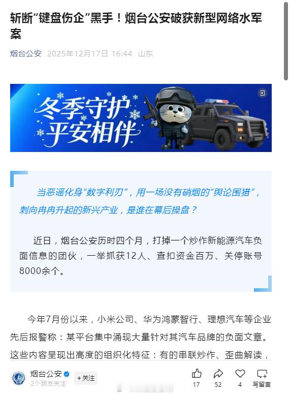 烟台公安 给力呀!又斩断一个“键盘伤企”黑手!近日,烟台公安历时四个月,打掉一个炒作新能源汽车负面信息的团伙,一举抓获12人、查扣资金百万、关停账号8000余个。烟台公安斩断键盘伤企黑手新能源汽车汽场全开汽车