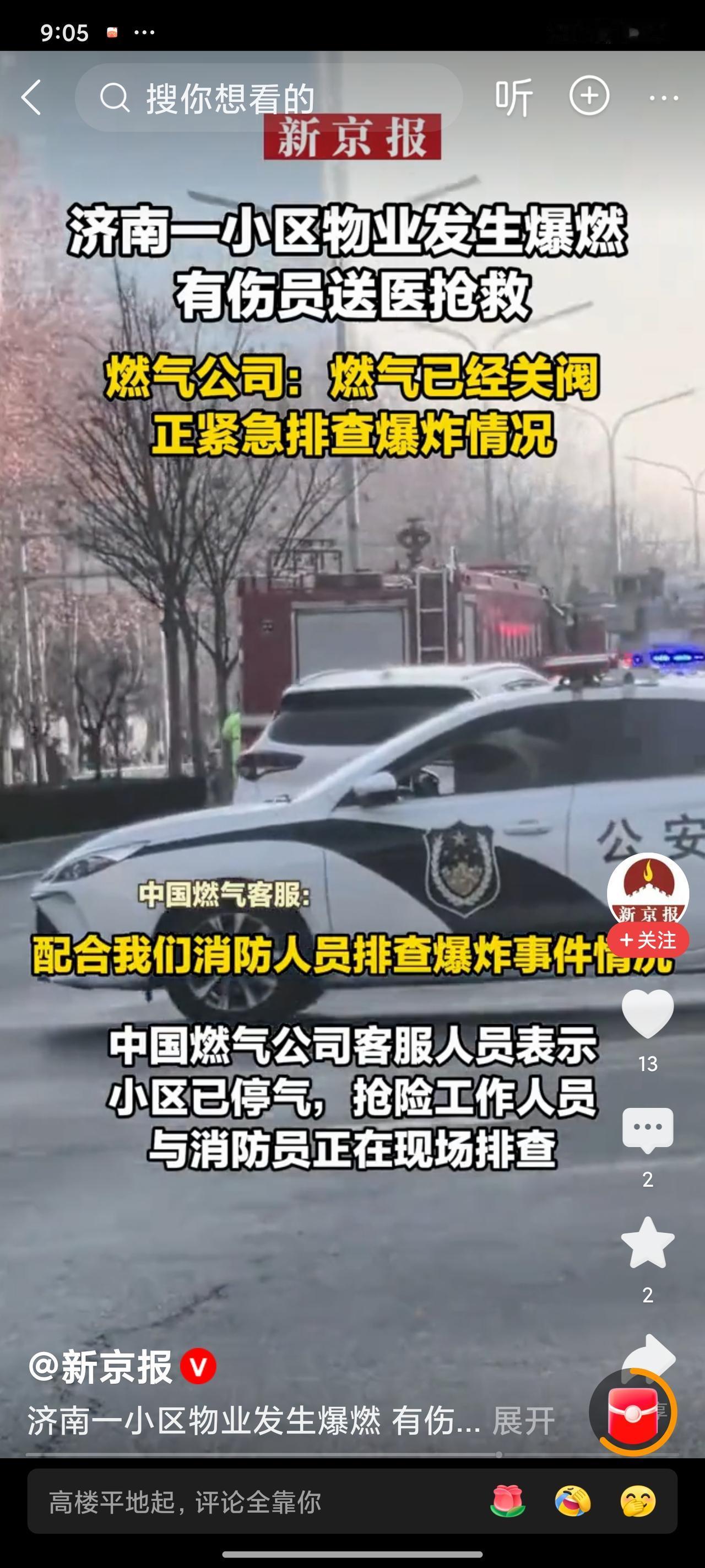 济南街头供暖主管道爆裂,现数米高水柱,周边多小区供暖受影响,官方回应:正在抢修 今日下午,济南奥体中路与花园东路交叉口处,上演了惊险一幕。供暖主管道突然爆裂,数米高的热水柱冲天而起,黑浑的水瞬间化作滚烫的白雾,引得路人纷纷驻足拍照。 路面因管道爆裂塌陷出大坑,挖掘机连夜展开抢修工作,现场被警戒线围得密不透风,车辆只能绕行。 此次事故影响了 3.36 万㎡的供暖区域,周边小区暖气供应直接中断。 官方表示,抢修工作预计要持续到 22 日。在这寒冷的天气里,居民们着实难熬。 网友锐评 - “停暖 5 天?只能穿着羽绒服睡觉了!” - “年年爆管,就不能提前好好检修吗?” - “抢修师傅太敬业了!在寒风中工作,必须点赞!” - “所幸没有人员受伤,但民生工程绝不能掉链子!” 个人看法: 寒冬时节停暖,实在让人心如刀割!供暖是民生的底线,爆管事件背后,必然存在巡检方面的漏洞。与其在爆管后紧急抢修,不如提前排查隐患,别让老百姓在冬天受苦,这才是真正的民生关怀!