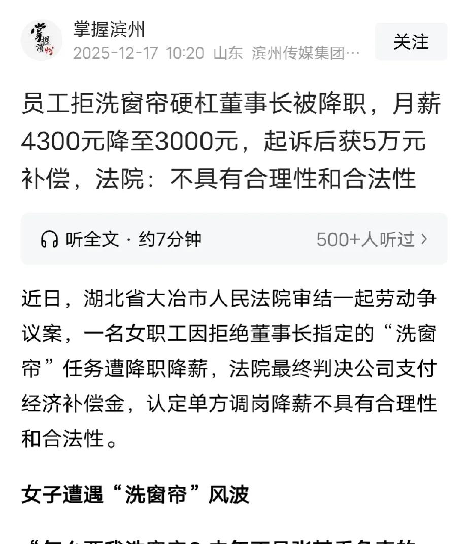 湖北大冶,女子是办公司主任,在公司干了10多年,某天突然接到老板电话,让她洗窗帘,女子抗议:去年不是我洗的,我不干。没想到,老板因此直接给女子降职降薪,把她的工资从4300降到3000元。女子告上法庭,声称:老板是因为多次追求她被拒绝后,才做出的报复行为。可公司却声称,这是正常的工作安排。最终,法院判了。 2012年6月份,吴女士经过应聘进入某家公司,入职后她对工作认真负责,兢兢业业,在公司一干就是10多年。 这10多年来,吴女士从小小的文员,一路做到办公室主任,薪水也由原来的两千多元升到最后每个月4300元。 这10年间吴女士在公司撒下了很多汗水也付出了不少努力,同时她也很珍惜这一份工作。 只是这几年间有一个问题一直困扰着吴女士,那就是有很多次老板对她进行骚扰,表明了想跟她有进一步的发展。 吴女士是有家室的人,老板是知道的,可他说他不介意,只要吴女士随了他的心意,他不会亏待吴女士。 吴女士为了打消老板的念头,曾经不止一次明确拒绝老板的追求。 老板对此耿耿于怀,总觉得以自己这样的身份,吴女士不该拒绝。 2023年1月份的一天,临近春节,公司需要提前搞卫生,为放假做好准备,老板就打电话给吴女士,要求她把办公室的窗帘洗了。 吴女士觉得很郁闷,她作为一个办公室主任,这根本不是她的职责范围内,这些活一直以来都是她底下的员工干的,老板突然亲自电话通知让她来洗,这很明显的就是针对自己。 吴女士可不怕他,就提出抗议说,怎么要我洗窗帘,去年不是张某秀负责的吗? 老板听完瞬间就来火,他回复吴女士,你不做就辞职,他的语气中很明显地表现出对吴女士的不满。 虽然老板这么说,但是吴女士没有把他的话放心上,不是她的活,她可不干。 没想到,因为吴女士这一句话,接下来老板的举动直接让她傻眼。 从2月2号到2月9号,公司连续召开两次针对吴女士的会议,会议最终决定,撤销吴女士办公室副主任职务,收回公章、仓库钥匙等物品及考勤、档案等权限,将她的岗位调整为打字员。 会议明确规定,吴女士在收到通知3日内得到新的工作岗位报到,如果超过3天没报到,视为旷工,旷工3天以上,视为自动离职。 吴女士傻眼了,就因为自己拒绝洗窗帘,公司就如此对待她,更过分的是,吴女士还没到新的岗位,公司已经招新人来代替她。 吴女士觉得这根本不是调岗是变相解雇她,吴女士多次要求,公司出具正式的解除劳动合同通知书,而公司方面则采取拖延策略。 吴女士因此申请劳动仲载,仲裁未果后,她告上法庭,庭上吴女士称,公司就是故意想惩罚她,才把调岗说得像是正常管理。 她觉得洗窗帘根本不是自己的工作,这就是老板因为她拒绝不合理要求,故意用剥夺工作条件、降职降薪的方式报复她,不光是工作上的纠纷,更是侮辱了她的人格。 公司辩称,从没提过要解雇吴女士,是吴女士主动要走的。为了证明这话,公司还说吴女士没上班的时候,他们照样给她发了部分工资,就是想留住她。 但吴女士不认可,她说公司收走了她的公章、仓库钥匙,还不让她考勤、管档案,这已经是不按合同给她提供工作条件。 她好几次让公司出正式的解除合同通知,公司却一直拖着,明显是想赶走她,又怕担法律责任,存着侥幸心理。 因此,吴女士提出跟公司解除劳动合同并要求双倍赔偿。 法院审理后认定,公司没有与吴某协商,仅因她拒绝承担本职外的洗窗帘工作就单方调岗降薪,该行为既不合理也违法,属于未按合同提供劳动条件。 法院未支持吴某主张的违法解除劳动合同及双倍赔偿诉求,但依据法律规定,判决公司支付吴某经济补偿金和未休年假工资共计5万余元,同时确认双方的劳动关系解除。 那么,公司单方调岗降薪的行为是否合法? 《劳动合同法》第35条规定,用人单位与劳动者协商一致,可以变更劳动合同约定的内容。变更劳动合同,应当采用书面形式。 岗位、薪资属于劳动合同核心条款,变更需遵循“协商一致+书面确认”原则,仅劳动者不能胜任工作、客观情况重大变化等法定情形下,用人单位可单方合理调整,且不得损害劳动者权益。 吴某本职为办公室副主任,洗窗帘属于职责外工作,公司未与其协商,仅以拒绝该任务为由单方调岗降薪,既无合法事由,也未履行书面变更程序,违反该法条规定,调岗降薪行为自始无效,同时构成“未按劳动合同约定提供劳动条件”。 公司需向吴某支付补偿的法律依据是什么? 《劳动合同法》第46条规定,劳动者依照本法第38条规定解除劳动合同的,用人单位应当支付经济补偿。 第38条明确“用人单位未按照劳动合同约定提供劳动条件”,劳动者可单方解除合同并主张补偿,经济补偿按劳动者在本单位工作年限,每满一年支付一个月工资计算。 公司违法调岗降薪符合第38条情形,虽因吴某证据不足,法院未支持其违法解除及双倍赔偿诉求,但仍依据第46条判决补偿。