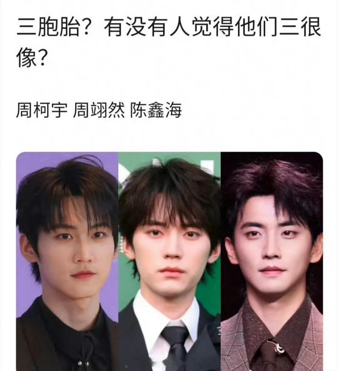 内娱新三胞胎,周柯宇、周翊然、陈鑫海,三个00生几乎共用一张脸,互为代餐不知道谁先出头周柯宇:狙击蝴蝶热播,待播金吾不禁周翊然:待播翘楚,🐧小王子陈鑫海:待播剧《表妹万福 》男主