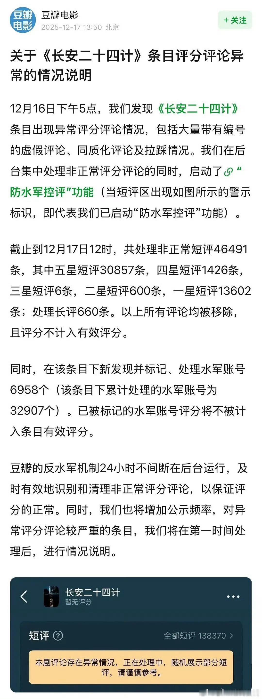 豆瓣回应长安二十四计异常情况豆瓣亲自锤评分由于氵军引发异常,还是在开播仅5天未开分的情况下。这种时候并不是路人观众会去评分的节点。想当初我组分析了《莲花楼》的短评数据,得出注氵的结论,从此粉丝挂我,一直给我和我组扣粉籍,到今天也是从此分明了。还是那句,走惯了捷径戒不掉的。我是一个人,对剧有主观喜好不假,但我当年也是看了莲花楼的,说几句真话就引人各种谩骂。台词就是差,数据多是氵,一年三扑(不是嘲是事实描述),个人毫无魅力。想让别人改观,你得努力提高。豆瓣正在处理中豆瓣正在处理中 豆瓣回应长安二十四计异常情况