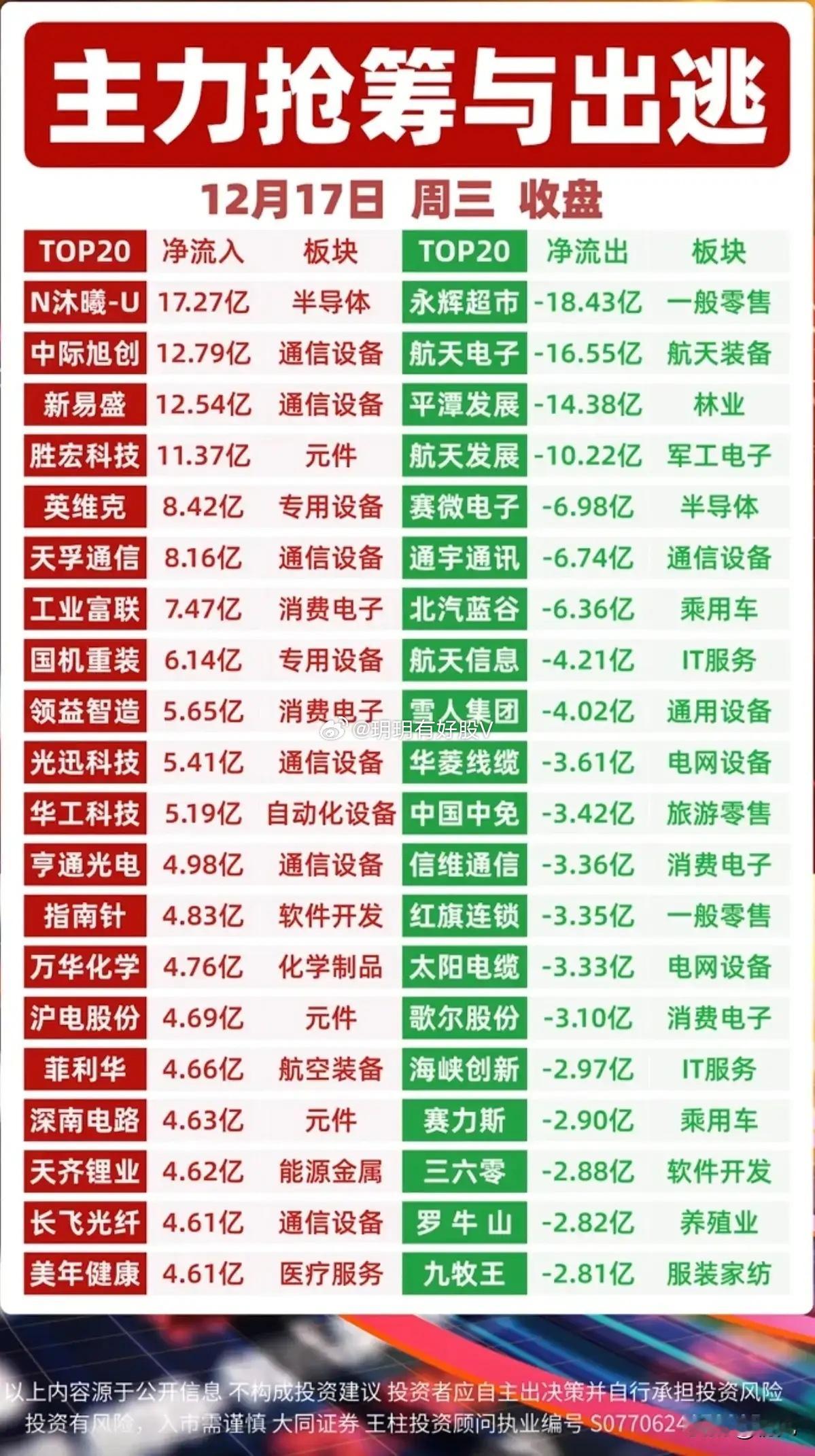 12月17日主力资金抢筹数据梳理分析今日收盘主力资金净流入端以半导体、通信设备等科技板块为主,N沐曦-U以17.27亿净流入居首,通信设备板块多只标的跻身前列;净流出端集中在一般零售、航天装备等领域,永辉超市18.43亿净流出为最大额。资金流向呈现科技板块受追捧、消费与军工等板块遭抛售的鲜明分化,且头部标的资金流动规模差距显著。主力资金净流入个股梳理分析1. N沐曦-U:净流入17.27亿,属半导体板块。作为新股,上市首日获主力巨额资金抢筹,成为当日净流入榜首标的,凸显市场对半导体赛道新股的高关注度与资金布局意愿。2. 中际旭创:净流入12.79亿,属通信设备板块。是通信设备板块净流入第二标的,大额资金流入反映出主力对通信设备赛道核心标的的坚定布局,板块龙头属性获资金认可。3. 新易盛:净流入12.54亿,属通信设备板块。与中际旭创形成通信设备板块资金双龙头格局,大额净流入体现主力对光通信等细分领域的看好,是板块资金布局的核心标的。4. 胜宏科技:净流入11.37亿,属元件板块。元件板块的头部标的获主力重金抢筹,半导体产业链上下游的元件领域成资金布局的重要方向,赛道景气度获资金验证。5. 英维克:净流入8.42亿,属专用设备板块。专用设备板块的核心标的获大额资金流入,数据中心、储能温控等细分赛道的成长预期,成为主力布局的核心逻辑。6. 天孚通信:净流入8.16亿,属通信设备板块。通信设备板块的又一核心标的,与中际旭创、新易盛形成板块资金梯队,光通信产业链获主力全面布局。7. 工业富联:净流入7.47亿,属消费电子板块。消费电子巨头获主力资金加仓,AI算力、消费电子复苏等多重逻辑支撑,成为板块资金配置的核心标的。8. 国机重装:净流入6.14亿,属专用设备板块。专用设备板块的二线标的获主力布局,高端装备制造的赛道价值获资金关注,板块内标的呈现梯队式资金流入。9. 领益智造:净流入5.65亿,属消费电子板块。消费电子板块的细分龙头获资金流入,消费电子产业链的零部件环节成资金布局的重要细分领域,板块热度持续扩散。10. 光迅科技:净流入5.41亿,属通信设备板块。通信设备板块的细分标的获主力加仓,光通信芯片等核心环节的技术壁垒与成长空间,成为资金布局的关键考量。11. 华工科技:净流入5.19亿,属自动化设备板块。自动化设备板块的龙头标的获资金抢筹,高端制造与智能制造的赛道逻辑,吸引主力资金积极布局。12. 亨通光电:净流入4.98亿,属通信设备板块。通信设备板块的老牌龙头获主力资金流入,光纤通信等传统优势领域的业绩稳定性,成为资金配置的重要支撑。13. 指南针:净流入4.83亿,属软件开发板块。软件开发板块的金融科技标的获主力布局,金融信息化与证券交易服务的赛道需求,成为资金关注的核心逻辑。14. 万华化学:净流入4.76亿,属化学制品板块。化工龙头获主力资金加仓,化工新材料的技术突破与业绩修复预期,成为资金布局的重要驱动因素。15. 沪电股份:净流入4.69亿,属元件板块。与胜宏科技形成元件板块资金联动,PCB等电子元件的赛道景气度,吸引主力对板块内多只标的进行布局。16. 菲利华:净流入4.66亿,属航空装备板块。航空装备板块的核心材料标的获资金流入,航空航天新材料的国产替代逻辑,成为主力布局的核心主线。17. 深南电路:净流入4.63亿,属元件板块。元件板块的又一核心标的获资金加仓,半导体封装与PCB赛道的双重属性,使其成为资金配置的优质标的。18. 天齐锂业:净流入4.62亿,属能源金属板块。锂资源龙头获主力资金布局,新能源产业链上游资源的价格企稳与需求复苏,成为资金布局的重要逻辑。19. 长飞光纤:净流入4.61亿,属通信设备板块。通信设备板块的光纤光缆龙头获资金流入,通信基础设施建设的持续推进,为标的带来资金布局机会。20. 美年健康:净流入4.61亿,属医疗服务板块。医疗服务板块的体检龙头获主力加仓,消费医疗的复苏预期与行业集中度提升,成为资金布局的核心逻辑。总结12月17日主力资金显著偏向半导体、通信设备等科技赛道,头部标的获巨额资金抢筹且板块内形成资金梯队布局;消费电子、专用设备等高端制造领域也获资金积极关注,赛道景气度与成长逻辑是核心驱动;而消费、军工等板块遭资金大幅抛售,整体资金流向呈现科技赛道抱团、板块间分化加剧的特征,新股与细分领域龙头成为资金布局的重点。本文涉及资讯、数据等内容来自网络公共信息,仅供参考,不构成投资建议!