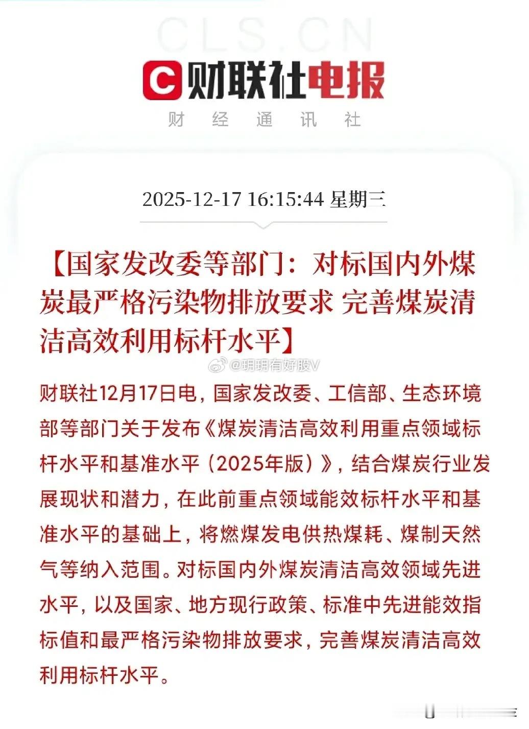 好消息!煤炭清洁高效利用新蓝图发布,这些公司将受益!刚刚,国家发改委、工信部、生态环境部等多部门,联合发布了《煤炭清洁高效利用重点领域标杆水平和基准水平(2025年版)》,标志着中国煤炭产业,向绿色低碳转型,按下了加速键。这不仅是一份技术标准,也是一幅指引万亿级产业,未来五年发展方向的战略蓝图!三大升级信号1. 范围扩大:新版将 “燃煤发电供热煤耗”、“煤制天然气” 等,关键领域正式纳入,覆盖更全,指向更精准。2. 标准提高:要求对标国内外,最严格的污染物排放要求,这意味着,行业的环保门槛,将会大幅提升。3. 路径清晰:通过设立 “标杆水平” 和“基准水平” ,为企业提供了从达标,到创优的清晰升级路径,旨在淘汰落后,激励先进。一场绿色溢价驱动的产业变革这一标准,并不是简单的环保约束,而是驱动资本聚集无,具备清洁高效能力的龙头企业,开启产业内部的价值升值。受益方向1. 传统火电龙头,迎来改造升级机遇新标准下,大量现有煤电机组,面临节能降碳改造压力。这为具备强大资本和技术实力,且自身机组能效水平较高的电力企业(华能国际、国电电力、华电国际),带来价值重估的机会。同时,从事节能改造,烟气治理的环保技术服务商(龙净环保、清新环境),将受益于订单增长。2. 高效清洁煤技术和装备企业,站上风口先进煤电技术:拥有超超临界、灵活高效燃煤发电技术的工程和设备龙头,东方电气、哈尔滨电气、上海电气等。煤化工升级:在煤制天然气和煤制烯烃等,现代煤化工领域,实现清洁高效生产的标杆企业,中国神华、中煤能源。核心装备:提供高效锅炉、煤气化炉、净化装置等,关键设备的龙头企业,海陆重工、华光环能。3. 煤炭龙头企业新标准,将加速行业内部优胜劣汰。具备以下优势的头部煤炭企业,将具备长期的竞争优势:资源禀赋优:拥有高热值、低硫、低灰优质煤矿的企业,陕西煤业、兖矿能源。一体化程度高:布局“煤-电-化”一体化产业链,抗风险能力强,能内部消化,并提升煤炭价值的企业,中国神华。技术实力强:在智能开采、矿区生态治理等方面领先,符合绿色矿山发展方向的企业。坐稳扶好!一场新标准驱动,贯穿煤炭开采、发电和转化等,全产业链的价值重估,即将启动了。在能源安全的基础上,绿色低碳,将成为煤炭产业,新的投资方向。你认为谁会成为,这轮煤炭新标准中的大赢家?是发电企业,还是技术装备商?点个赞👍🏻❤️就是对我的最好的支持。谢谢你!