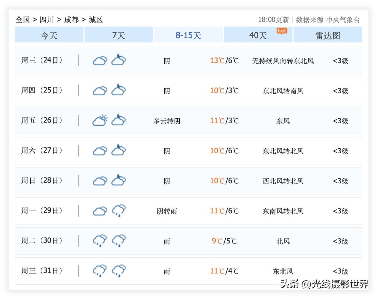 一个好消息,一个坏消息,四川省成都市,12月18日到23日,经常有大太阳,非常温暖,最高气温16度,真的是暖洋洋的暖冬啊!不过……12月25日以后……成都的太阳公公可能会去流浪,阴天可能是主旋律……尤其是12月29日到31日,成都市如果每天下雨,阴冷潮湿的……可能真的会跌入冰窟窿啊! 总体来说,我感觉,12月24日以后,成都人,重庆人,有钱有闲的,应该都会去云南海南,再不济也要去个西昌攀枝花……大家觉得呢?! 重庆,成都,迄今为止,都可以说是暖冬,尤其是成都,今年11月12月的太阳真的太多了啊! 2025年最后两个月,成都总体来说,是比较舒服的!不错不错!
