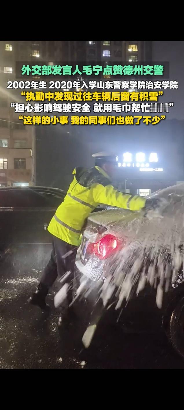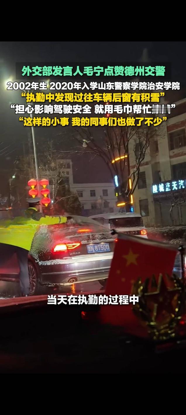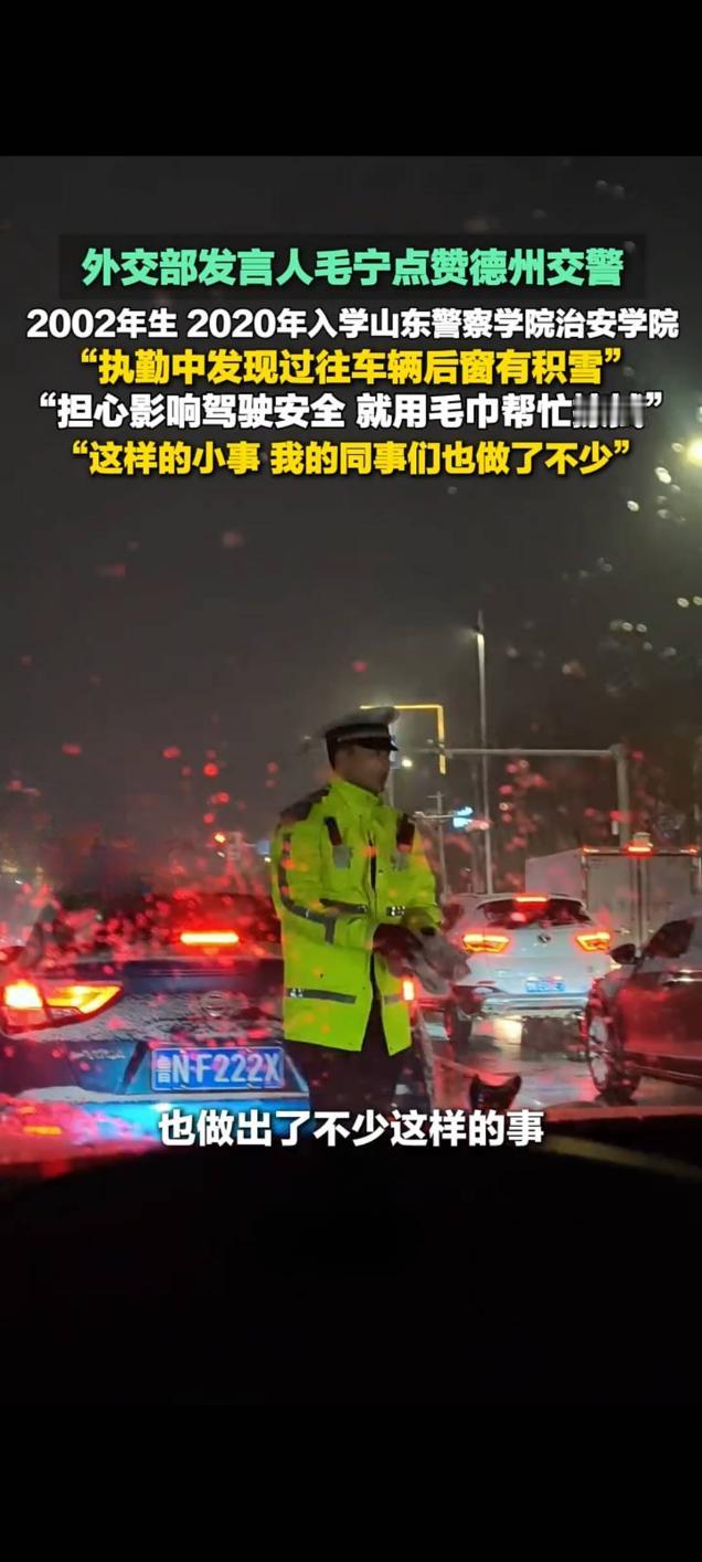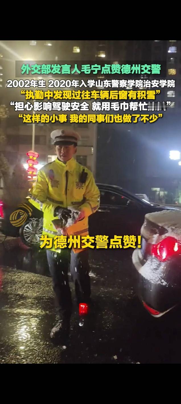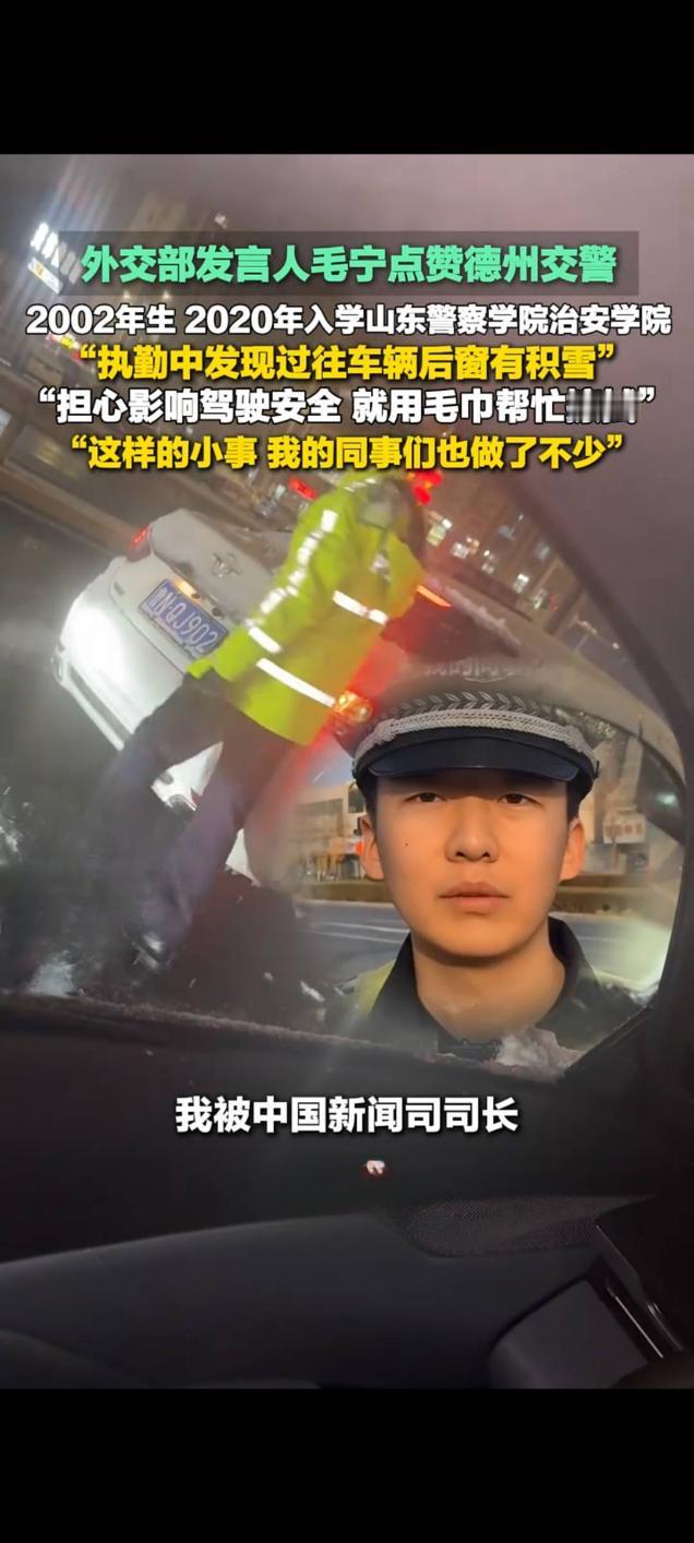 00后德州交警获外交部发言人点赞,谦逊回应:我的同事们也做了不少 近日,一名德州交警因一段暖心执法视频走红网络,其专业而人性化的工作态度甚至获得了外交部发言人毛宁的公开点赞。随着视频在快手等平台广泛传播,播放量已超过2.4万次,这位备受瞩目的民警身份也得以揭晓。 据了解,这名交警是一名标准的“00后”,出生于2002年,于2020年考入山东警察学院治安学院,毕业后成为德州市公安局交通警察支队的一名基层民警。他在执勤中耐心细致、充满温度的执法过程被市民记录并传播,不仅赢得了网友的普遍赞誉,其体现的文明风貌也获得了毛宁的肯定。 面对来自各方的关注和赞誉,这位年轻的民警表现得十分谦逊。他在回应时表示,自己只是做了职责范围内的平常事,并特别强调:“这样的小事,我的同事们也做了不少。”这一朴实而真挚的回应,折射出广大基层警务人员默默奉献、服务为民的职业精神,也让公众看到了新一代年轻民警的责任与担当。 此事在网络持续发酵,网友纷纷留言“平凡中见伟大”、“这就是中国青年警察的样子”,一次普通的执法互动,成为了传递社会正能量的生动注脚。交警走红 交警标兵
