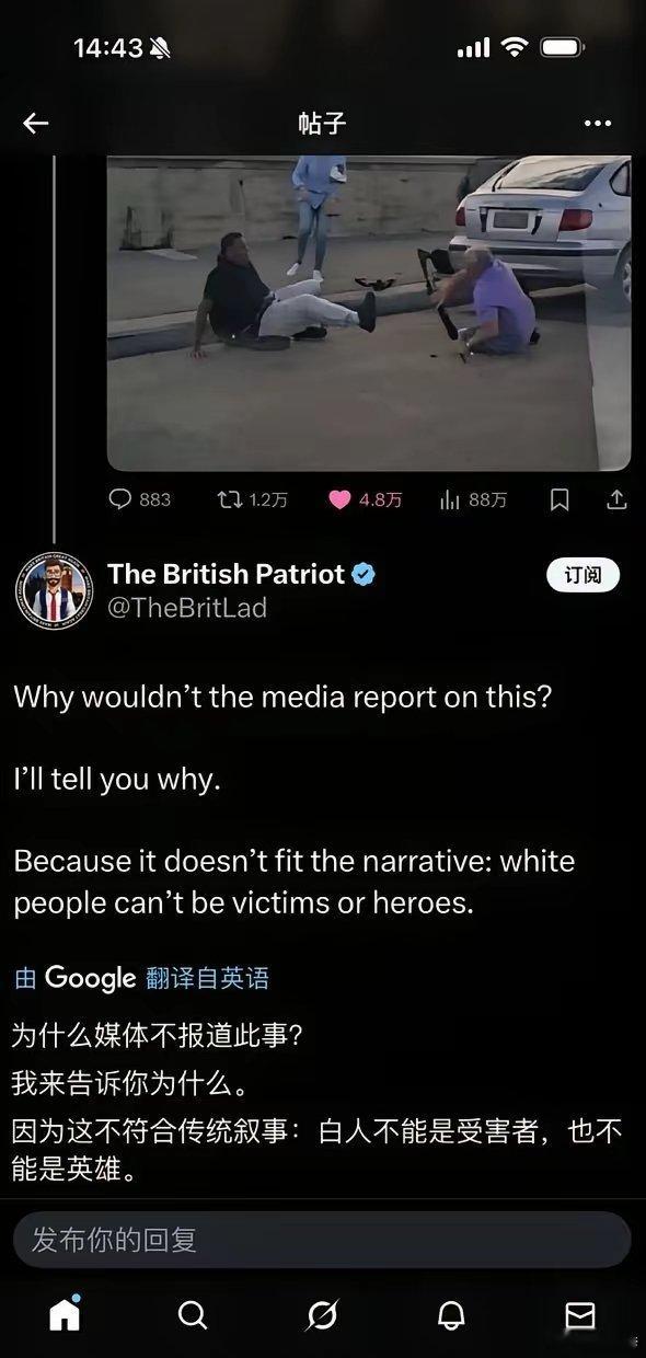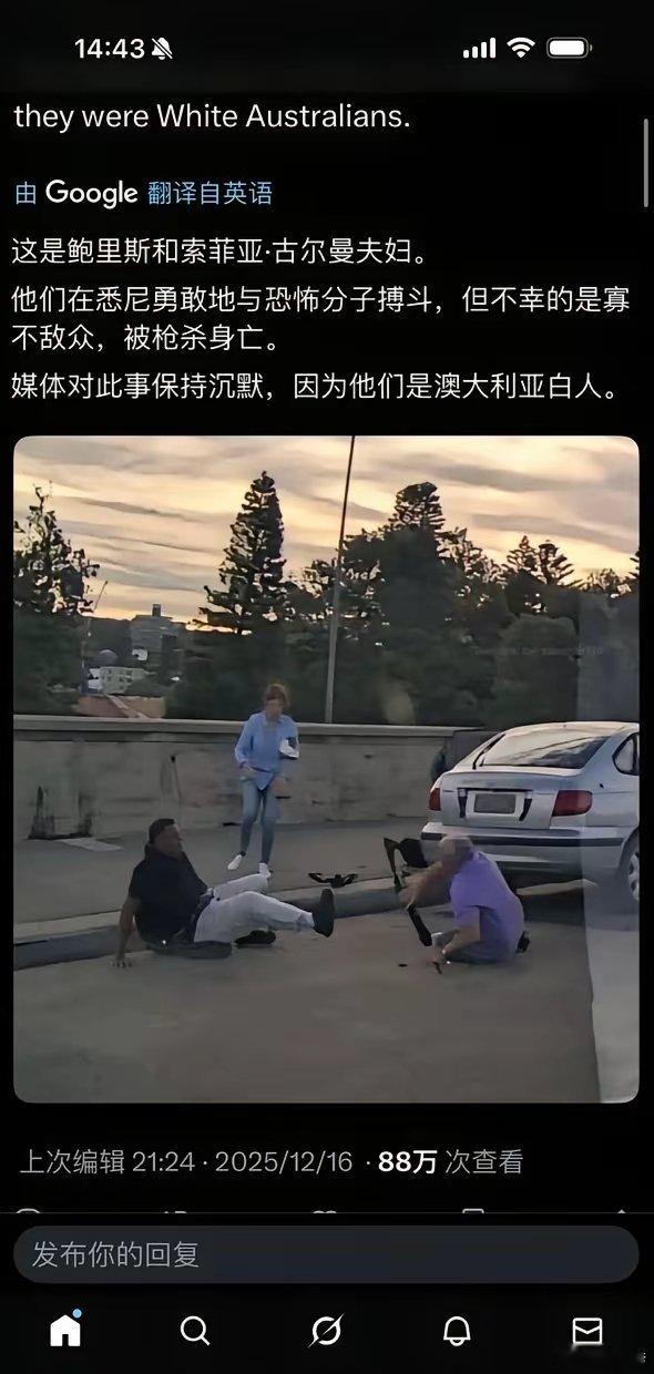 澳大利亚悉尼暴恐中,有两位白人也与恐怖分子进行了搏斗,但没有得到那名叙利亚人一样的关注。 至于媒体为什么不报道?原因是,因为这不符合它们一贯的叙事:白人是种族主义者,不是受害者,更不是英雄。