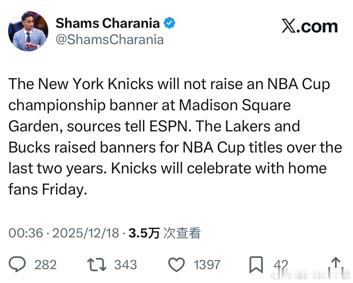 Shams:尼克斯将不会在麦迪逊广场花园升起NBA杯冠军旗帜。