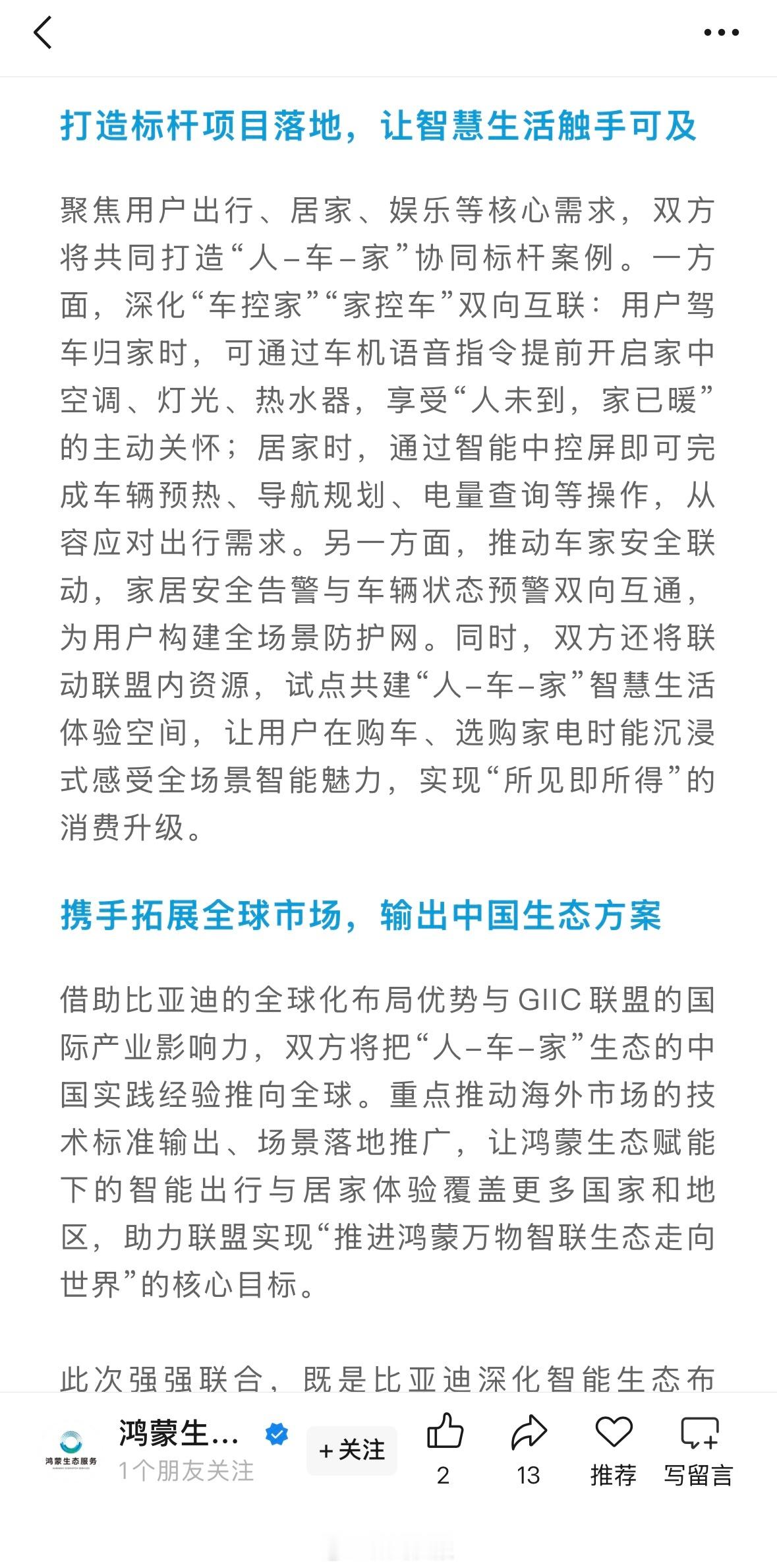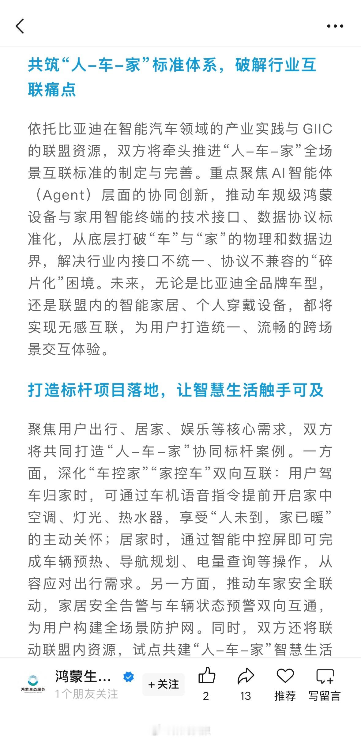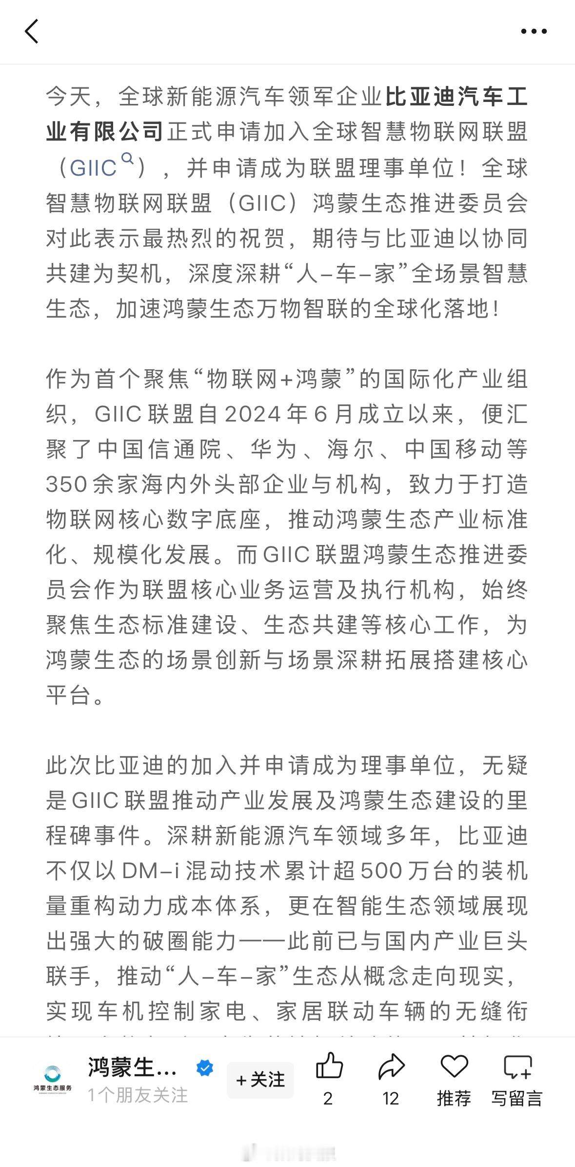 重磅!比亚迪正式申请加入全球智慧物联网联盟并申请成为理事单位,共启“人-车-家”万物智联新征程!比亚迪拥抱华为鸿蒙生态