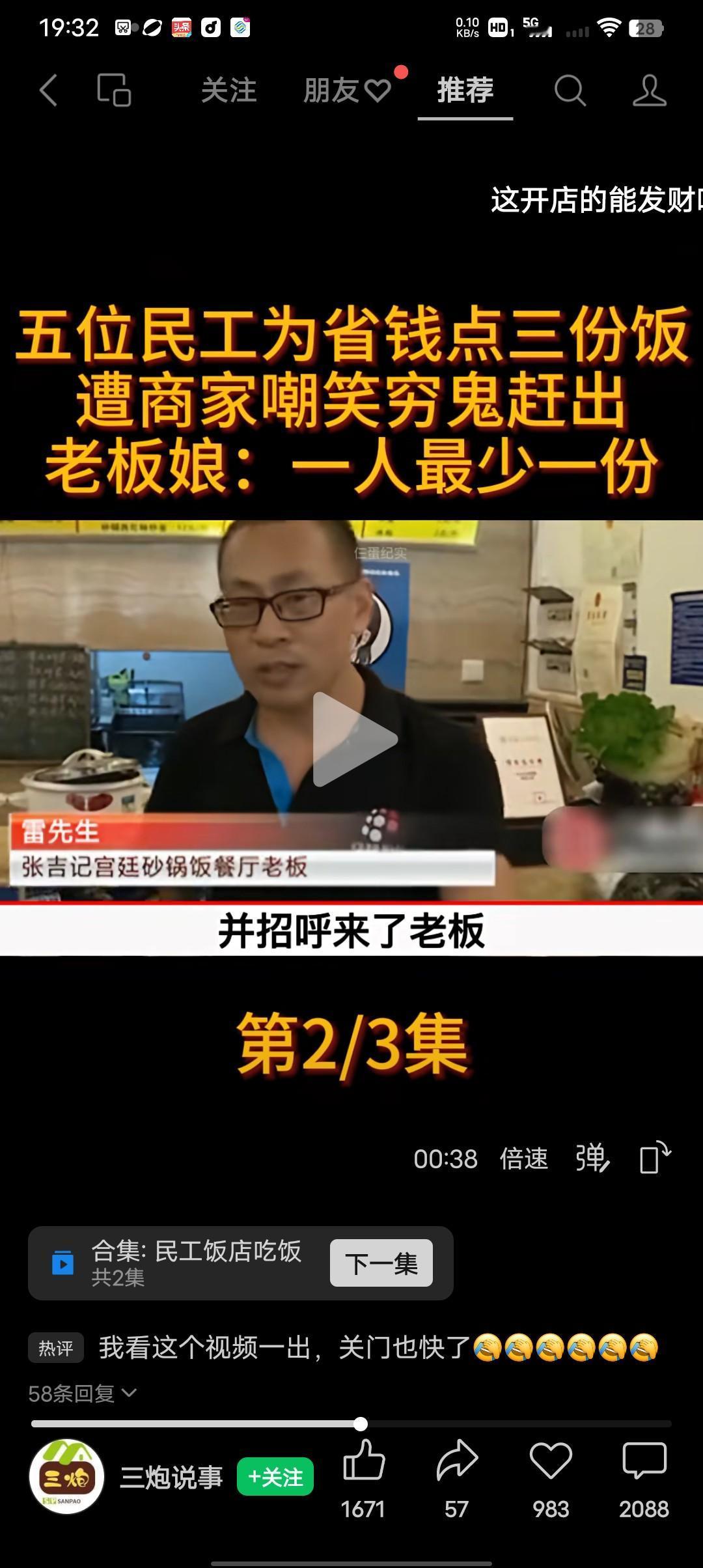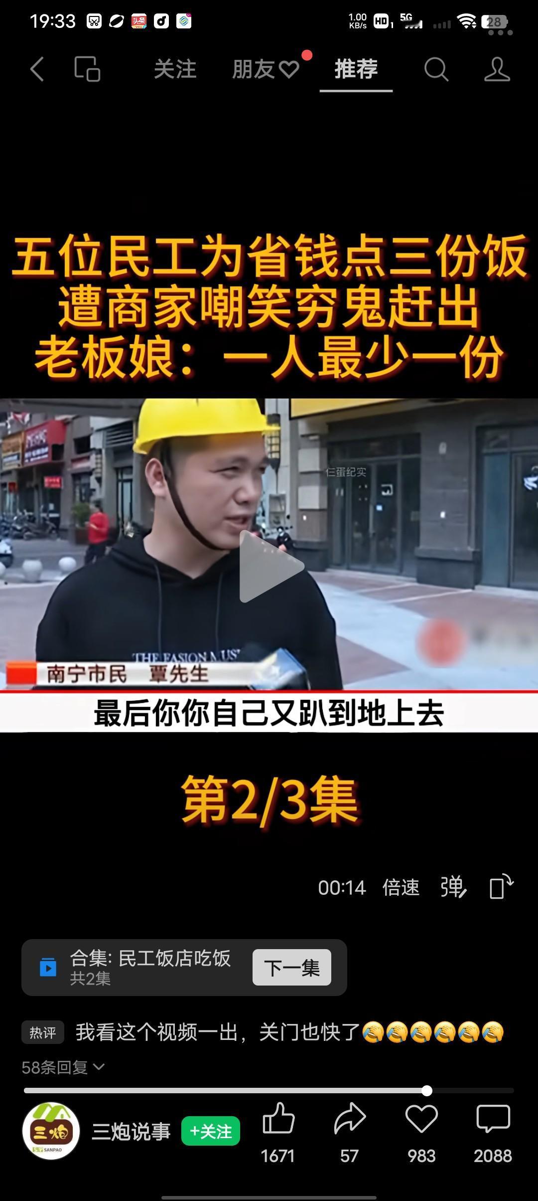 气死我了,真的有狗眼看人低的东西! 五名农民工大哥,为了省钱点了三份砂锅,遭商家嘲笑穷鬼赶出。 张吉记宫廷砂锅饭餐厅老板雷先生:你进了我的餐厅就要遵守餐厅的规矩,我这是套餐必须要一人一份,否则就别在我这里吃。 农民工大哥覃先生:我们本着吃多少买多少的想法我觉得没错,结果他们上了砂锅不给我们上主食,他们就是故意刁难。他们上了砂锅不上主食,那三份砂锅,我们没动,既然他们不给我们上主食,凭什么不让我们走?我们想走他们不让走还打人,老板耍赖就自己躺在地上。 后来餐厅老板以农民工吃霸王餐还打架为由报了警,警察到的时候看到老板躺在地上,农民大哥确实没有付钱,民警只能把农民大哥带到派出所,最后经过协商,五名农民大哥凑了2千块钱,说是餐厅老板的精神补偿。 我相信看过这个视频的所有的人,都会为农民大哥们抱不平,当看到民警让农民大哥拿2千块钱给餐厅老板的时候,下面的网友炸锅了,凭啥叫农民工大哥给2千块钱,人家吃多少买多少给多少钱没错呀?狗眼看人低的东西,我是农民工大哥盖的?农民大哥比你们高贵的多,相信这个视频已出这个餐厅离关门也不远了,祝这个餐厅关门大吉!我说的。