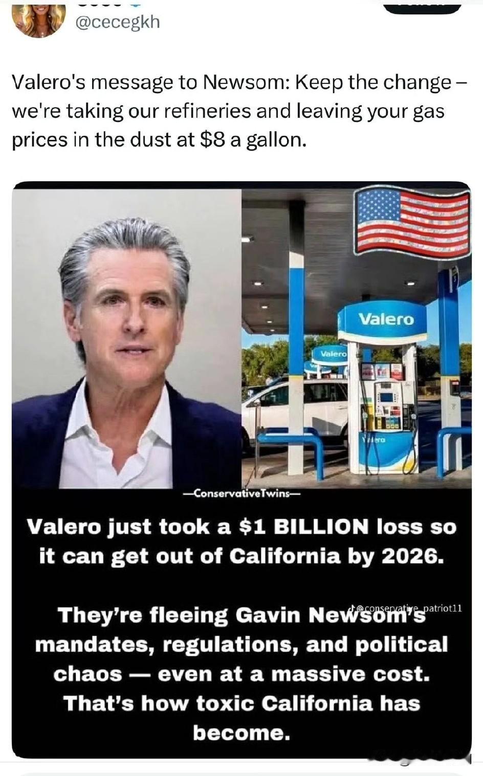Valero刚刚损失了10亿美元,这样它就可以在2026年离开加州。(離開需要留下買路錢) 他们正在逃离Gavin Newson的強制、法规和政治混乱——即使付出了巨大的代价。 加州变得如此有毒。