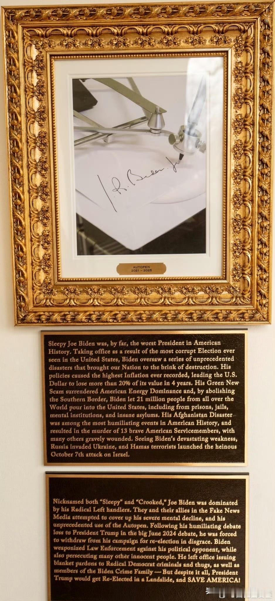 白宫“总统墙”,在图片下增加注解:Biden“史上最差、最腐败、最无能”;Obama“最分裂”、制造了“通俄骗局”和“昂贵医保”; 里根“是Trump的粉丝”等等 近期曝光照片显示,总统墙的肖像下方添加了文字注解: 拜登标注为“史上最差、最腐败、最无能”; 奥巴马被指“最分裂”“制造通俄骗局和昂贵医保”; 里根则标注“是特朗普的粉丝”。 这些标签以红字突出关键词(如“腐败”),被质疑将官方场所变为政治攻击工具。 特朗普的意图与操作手法 符号化羞辱对手:用“签名笔”替代肖像,暗示拜登执政缺乏自主性;注解标签则直接否定民主党总统的历史地位,将个人评价植入国家历史展示空间。 延续个人政治风格:此前特朗普已多次改造白宫装饰,例如悬挂描绘自己遇刺场景的画作《战斗,战斗,战斗》,或摆放林肯、里根与自身并列的油画,强化保守派叙事。 此举引发争议,支持者视其为“揭露真相的正义之举”,呼应特朗普“打破政治正确”的人设; 反对者批评“幼稚且分裂”,《纽约时报》等媒体指出此类操作将严肃宪政争议降格为“政治闹剧”。