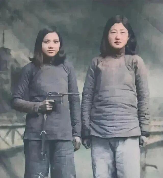 珍贵怀旧老照片革命老根据地刚刚翻身解放的女妇救会干部!高兴的到城里照像馆拍个照片。左边这位竟然拿着“二把盒子”对着右边这位。犯了枪不能对着自己人的大忌啊!