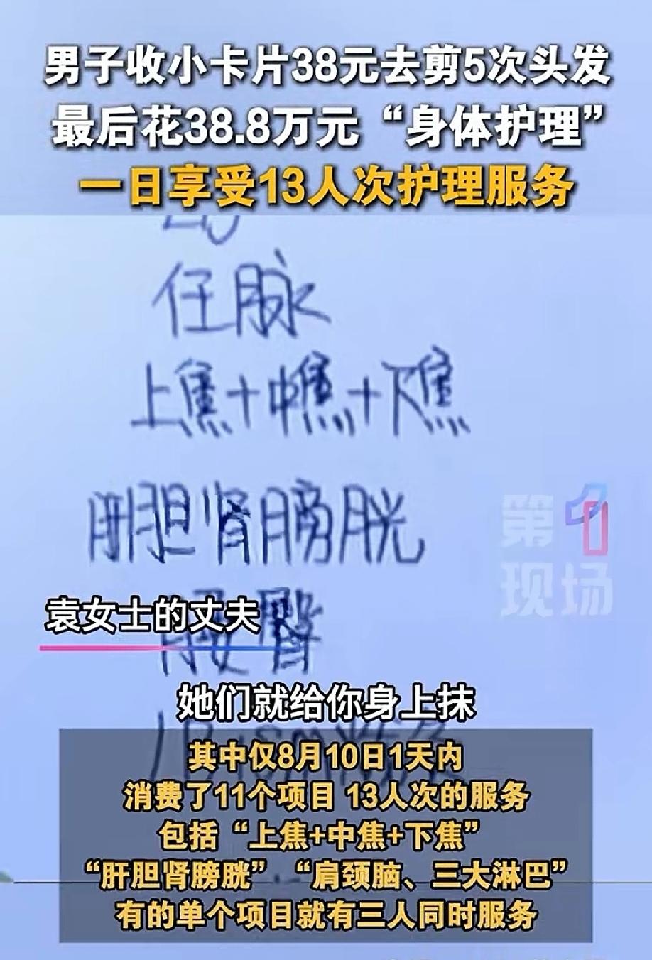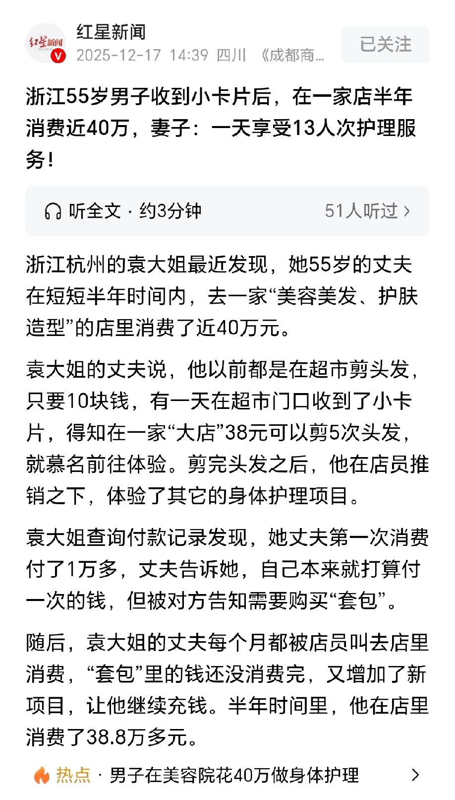 浙江杭州,55岁男子在超市门口收到一个小卡片,得知某美容店38元就能剪发5次,非常实惠。男子抱着捡便宜的心态前去体验,结果在店员的推销下上了二楼。尝到甜头的他从此一发不可收拾,短短半年时间内去了31次,消费近40万元,最夸张的是,他一天内接受13人次服务,有的项目竟然同时有3人服务。男子妻子得知后,找到店方理论,店方主动退还了13.1万。更奇葩的是,有关部门表示,初步排除涉黄问题。 偶然得知丈夫有大额支出,袁大姐愣住了,她怎么也想不到,平时连10块钱剪头发都嫌贵的丈夫,竟然会在一家美容店消费了近40万。 袁大姐的丈夫55岁了,平日里格外节俭,剪头发从来都是找超市门口10块钱的快剪摊。 这天,他刚走出超市,就被一张小卡片吸引了目光,上面写着38元能剪5次头发,而且还是店面比较大的美容美发店,这可比快剪要划算的多。 大叔心里乐开了花,暗喜捡了个大便宜,当即揣着卡片直奔这家美容美发店。 进店剪完头发后,店员热情地凑上来推荐,他们二楼还有身体护理项目,既放松又舒服。 大叔本想拒绝,可架不住店员嘴甜,想着反正剪发体验不错,就半推半就地上了二楼。 这一体验可不得了,舒服的按摩让他瞬间卸下了疲惫,心里盘算着偶尔来放松一下也挺好。 可他没想到,这一脚踏进去,就再也没能轻易出来。 第一次体验护理,店员就推荐他办“套包”,说单次付款不划算,套包优惠力度大。大叔耳根子软,稀里糊涂就付了1万多。 本以为这钱够花一阵子,结果没过多久,店员又轮番上阵,说新出的项目效果更好,还能升级套包享受更多福利。 大叔被说得晕头转向,想着已经花了这么多,不升级好像亏了,于是一次次掏钱充值。 套包还没消费完,新的项目又接踵而至,他像被牵着鼻子走的木偶,完全没意识到自己已经越陷越深。 直到袁大姐偶然翻到丈夫的付款记录,看着一串密密麻麻的消费明细,差点当场晕过去。 她赶紧拉着丈夫去店里对质,一查消费记录,夫妻俩都傻眼了:短短半年时间,丈夫竟然去了31次,累计消费38.8万多元。 更夸张的是,8月10日那天,他一天就做了11个项目,接受了13人次的服务,什么“上焦、中焦、下焦三焦护理”“肝胆肾膀胱护理”,甚至还有3个人同时围着他服务的项目。 袁大姐气得浑身发抖,质问店员:你们到底给他做了什么项目,能半年花掉近40万? 面对袁大姐的怒火,店方态度软了下来,主动退还了13.1万元。 不仅如此,这还很快引起了当地商务、市监、公安等部门的关注。 经过初步调查,有关部门排除了涉黄问题,但发现该店存在超限额充值的违规行为,已被责令限期整改。 目前,有关部门还在进一步调查取证,一旦发现其他违法违规行为,将依法严肃处罚。 对此,不少人怀疑,要是不涉黄,怎么能一下子,消费这么多呢。 抛开涉黄问题不说,美容店的行为至少构成侵权。 一、美容店超限额充值,违反预付式消费监管规定。 《单用途商业预付卡管理办法》第二十二条:单张记名预付卡资金限额不得超过5000元,单张不记名预付卡资金限额不得超过1000元。 本案中美容店以“套包”形式诱导大叔多次充值,累计消费达38.8万元,明显超出预付卡法定资金限额,属于典型的超限额发卡行为。 大叔最初仅因38元5次剪发的低价优惠进店,却在店员轮番推销下陷入“充值-升级-再充值”的循环,其充值金额远超合理消费需求,且美容店未对充值限额进行任何提示,也未明确告知套包消费规则。 该行为不仅增加了消费者的资金安全风险,还通过大额预付卡绑定消费者,限制其自主选择权,违反了预付式消费监管的核心立法目的。 二、美容店强制捆绑“套包”消费,侵犯消费者自主选择权。 《消费者权益保护法》第九条:消费者享有自主选择商品或者服务的权利。消费者有权自主选择提供商品或者服务的经营者,自主选择商品品种或者服务方式,自主决定购买或者不购买任何一种商品、接受或者不接受任何一项服务。 大叔最初仅想体验剪发服务,却在店员诱导下接受二楼护理项目,后续又被强制要求购买“套包”才能消费,且套包未消费完就被推销新的升级项目,完全丧失了自主选择的权利。 美容店将单次服务与大额“套包”强制捆绑,以“单次付款不划算”等话术变相逼迫消费者充值,违背了消费者的真实意愿。 从消费记录来看,大叔一天接受13人次服务、部分项目3人同时服务的情况,明显超出合理消费需求,可见其已被美容店的推销模式裹挟,失去了对消费项目和金额的自主决定权。 因此,美容店的该行为严重侵犯了消费者的自主选择权,大叔有权要求解除套包合同,退还未消费部分的款项。 男子在美容院花40万做身体护理