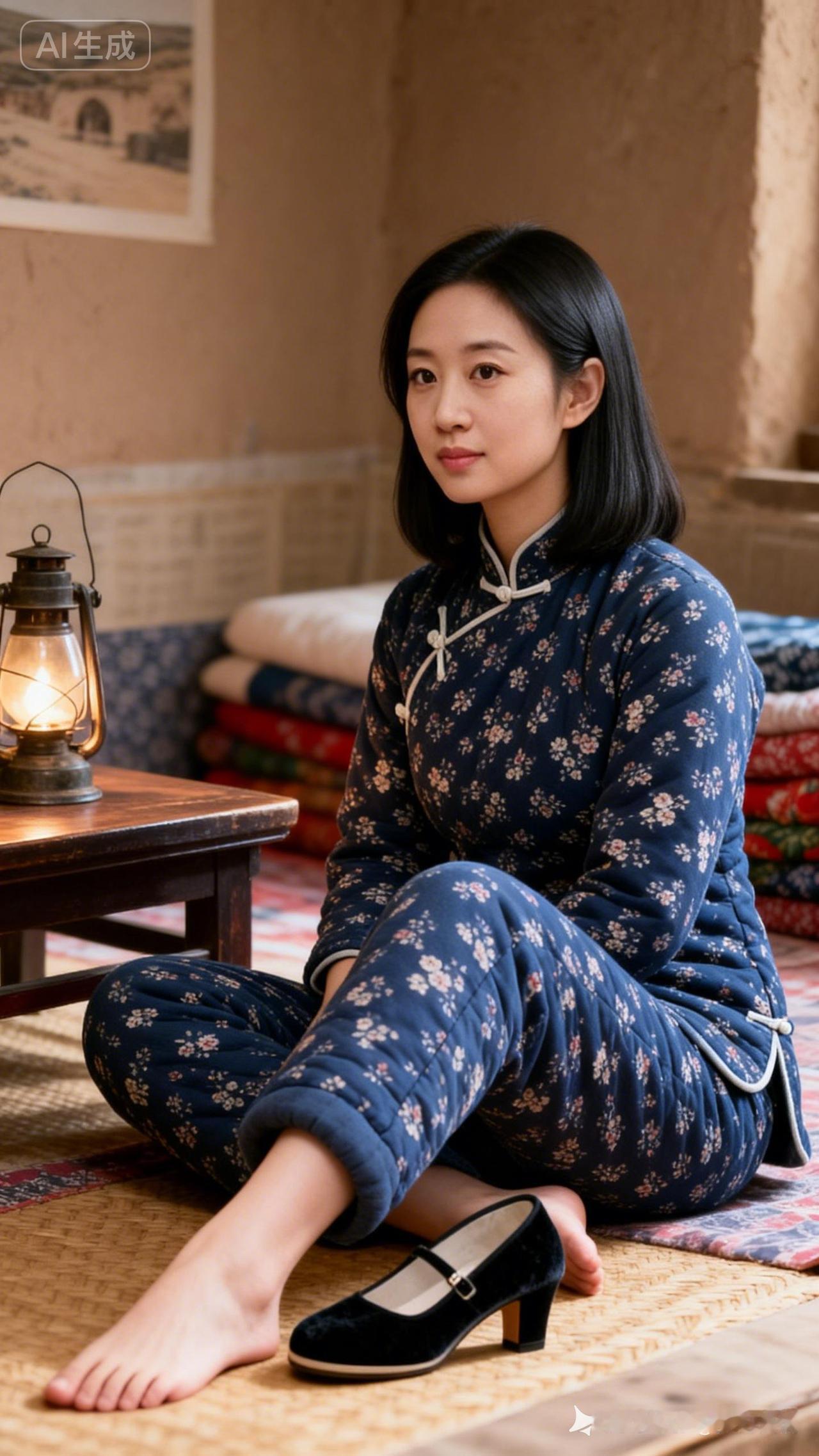 复古风穿搭,蓝色印花睡衣,搭配黑色高跟鞋,优雅又舒适。