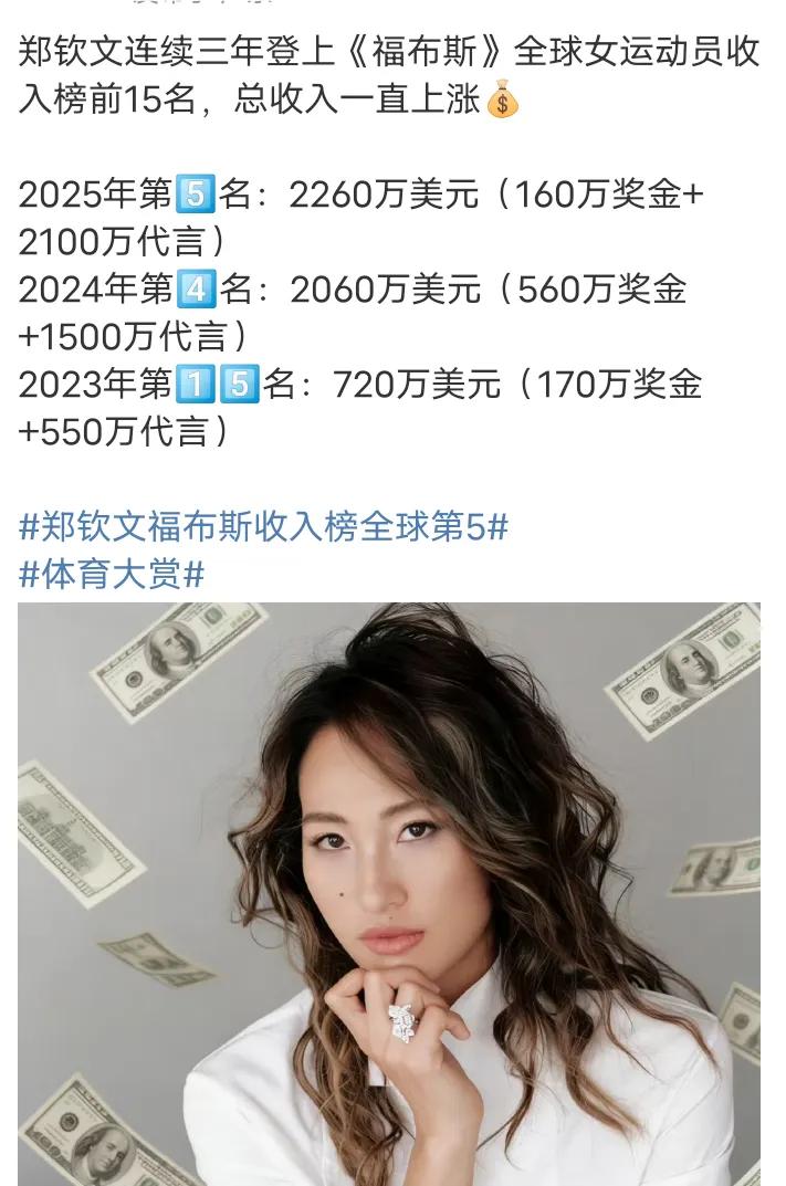 郑钦文2025年奖金最多的一站是法网八强,你猜她一年赚了多少钱,福布斯榜第5!而且连续三年登上《福布斯》全球女运动员收入榜前15名!