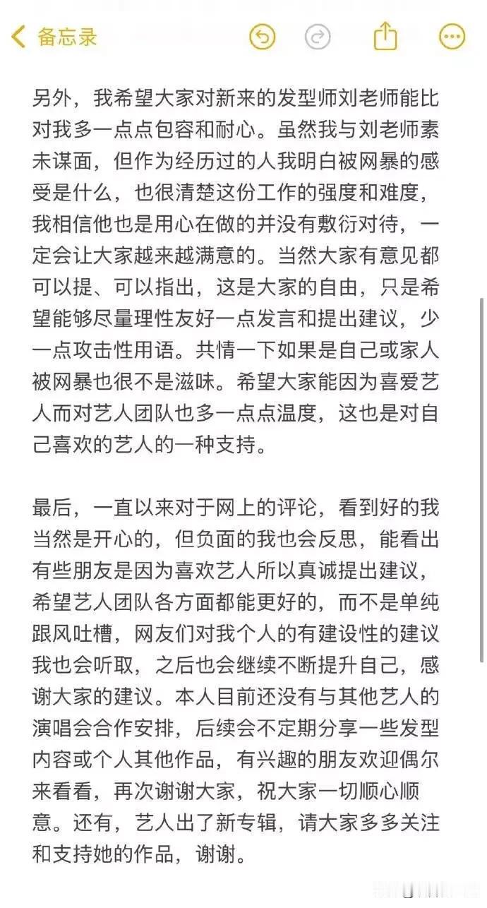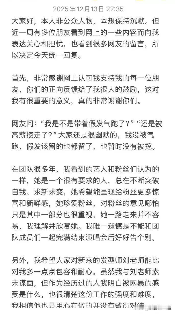 张韶涵“觅光”巡演造型可真是闹得沸沸扬扬。2025年巡演频繁因造型上热搜,汕头站换了新发型师,新造型却遭网友疯狂吐槽,还被调侃“裁员裁到大动脉”。 12月7日张韶涵发文表达求新求变的态度,而前发型师张振13日也发长文回应,称离职跟网暴、高薪挖角都没关系。他唯一遗憾没和团队好好告别,还呼吁大家对新发型师刘老师多些包容。 以前张韶涵造型频频出圈,张振功不可没,现在新造型遇冷,希望大家能给新造型师点时间,也让张韶涵继续在造型上玩出新花样。