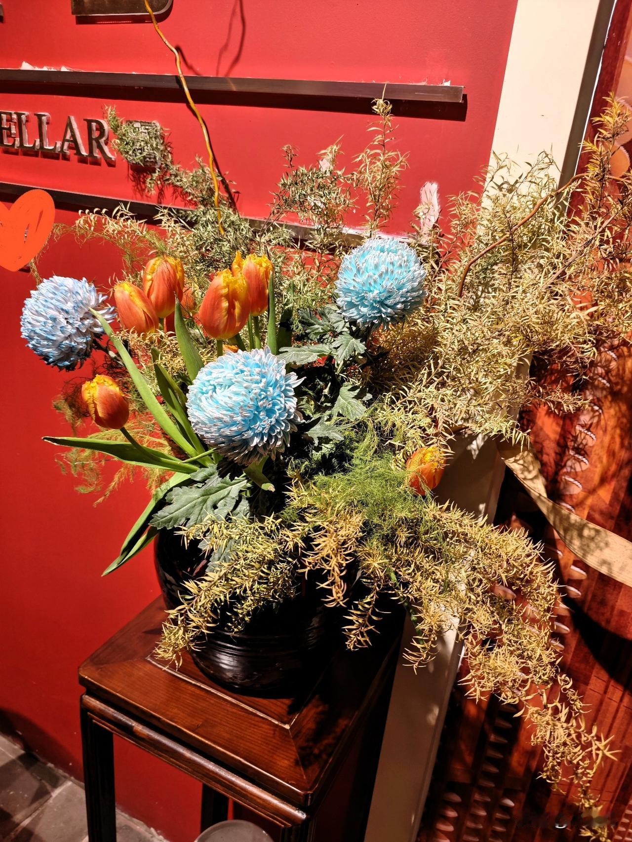 小姐妹们,今天逛店偶遇这束花直接被美晕! 蓝盈盈的刺芹像捏了把碎冰,橙红郁金香挺着腰杆特精神,配着金丝丝的枝叶,红墙当背景板简直绝了~ 就喜欢这种撞色的鲜活劲儿,冷调的蓝撞上暖调的橙,再搭着复古红墙,看着就心情敞亮。 生活里的小美好大概就是这样,转角遇见一束戳中审美点的花,瞬间把琐碎都冲没啦✨