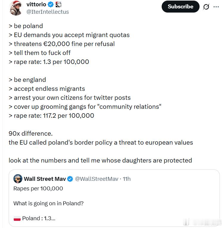 如果你是波兰欧盟要求你接受移民配额拒绝的话威胁罚款 2 万欧元你就回一句“滚蛋”强J率:每 10 万人 1.3如果你是英国接纳无尽移民因推特帖子逮捕本国公民为了“社区关系”掩盖性侵团伙强J率:每 10 万人 117.2相差 90 倍。欧盟称波兰的边境政策威胁欧洲价值观。看看这些数字,谁家的女儿更安全?
