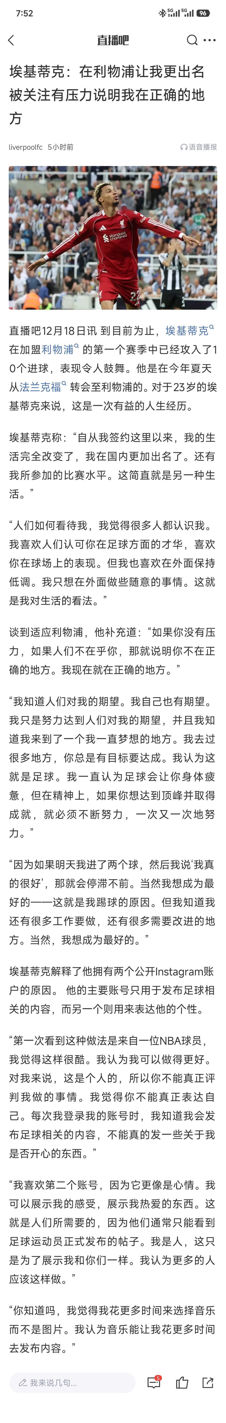 埃基蒂克觉得他加盟利物浦对了! 本赛季在英超表现还行,考虑到第一年踢英超,利物浦又动荡一会主力一会替补,他确实非常好。 还入选法国队,明年世界杯大概能去。 这就是加盟豪门的关注度,比在小球队强多了,所以球员都想去豪门。[得意]