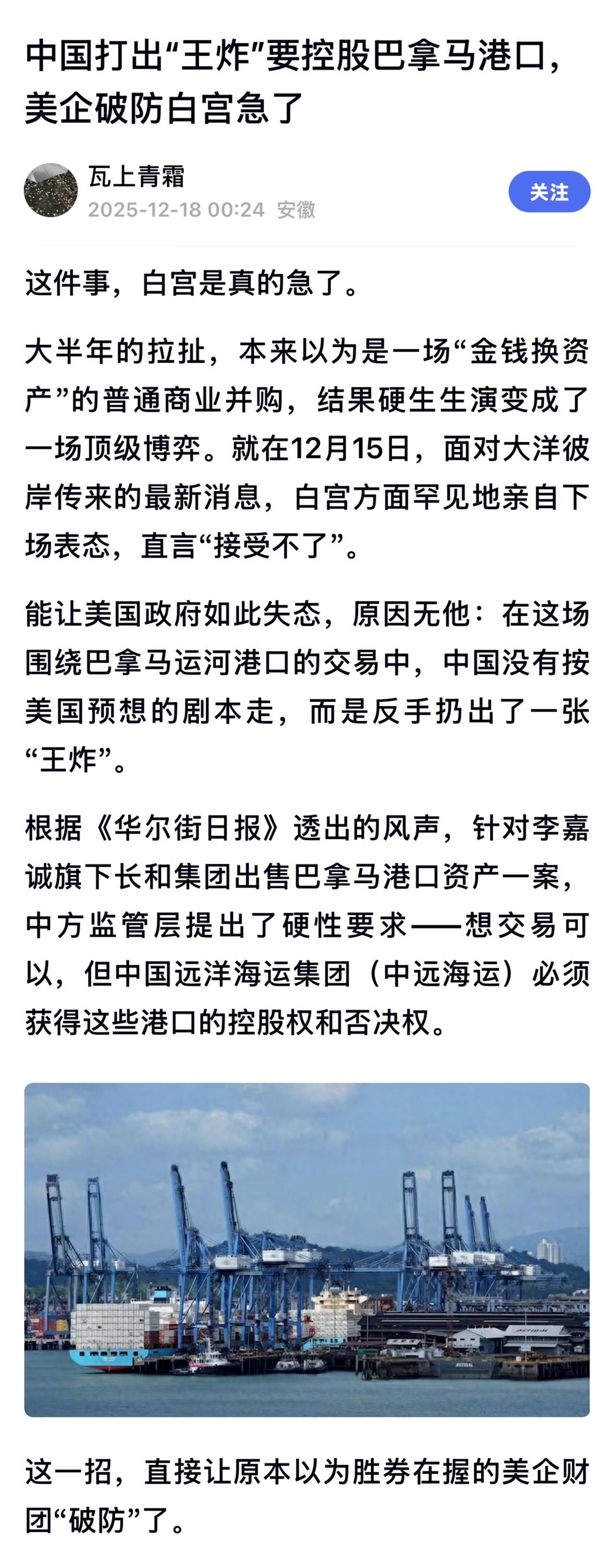 长和集团今年3月同意以228亿美元将其包括巴拿马港口在内的海外港口业务出售给美国和意大利财团。此举引发中方关注并启动调查。为促成交易,长和7月底表示拟邀请中国投资者加入买方财团。 然而目前谈判陷入僵局,中方要求对港口拥有控制权及运营否决权,而美国表示不会接受这样的条件。白宫官员说:“特朗普总统已经明确表示,中国控制巴拿马运河是不可接受的,这违反了《美国一巴拿马条约》。” 目前交易停滞,中方或将其作为中美谈判筹码,而长和则继续运营相关港口,预计交易完成可能推迟至2026年。