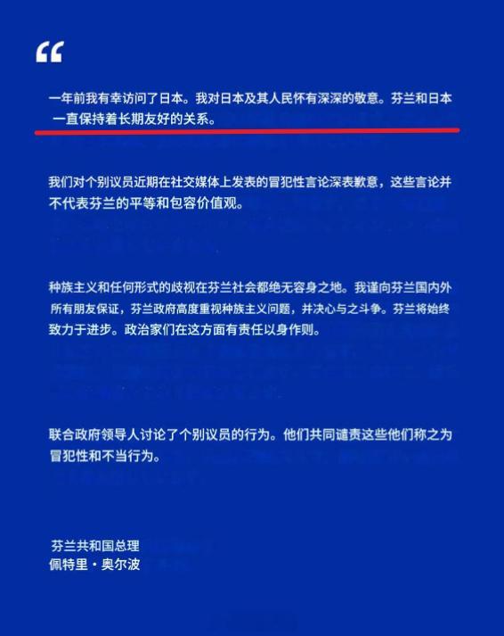 芬兰小姐侮辱中国人,这次日本社会表现的非常强烈,谴责芬兰种族歧视,12月17日,芬兰驻日本大使馆官方X账号更新了推文,发布了芬兰总理佩特里·奥尔波对日本的道歉声明。怕日本人误会?太荒谬了!