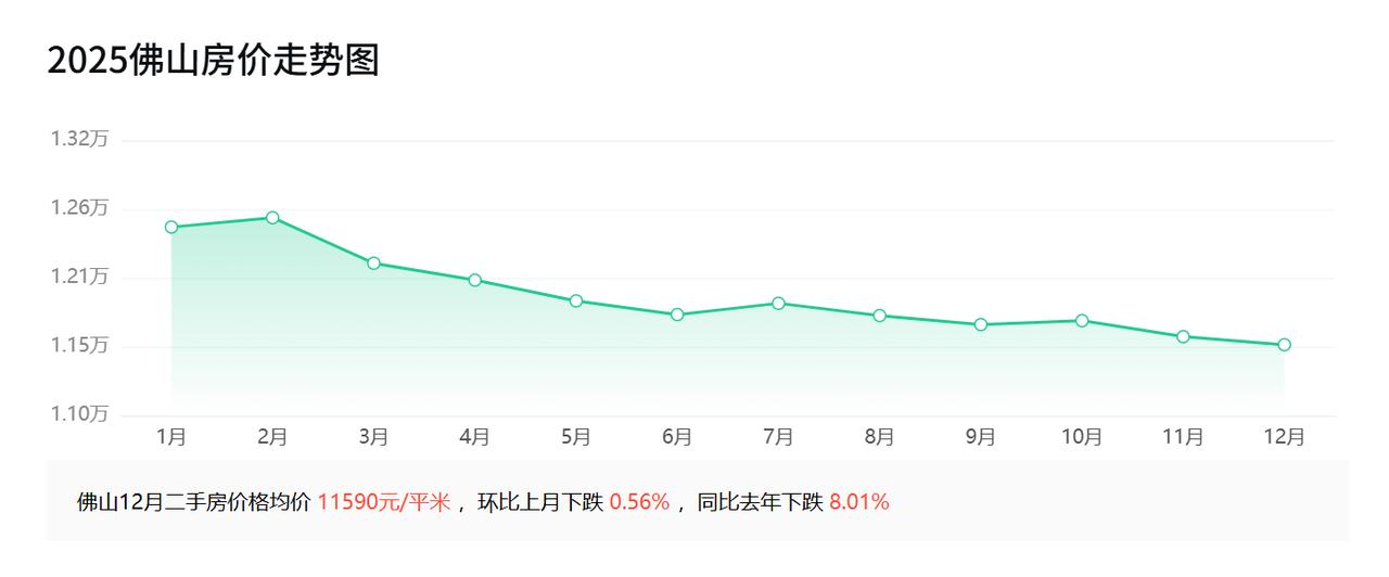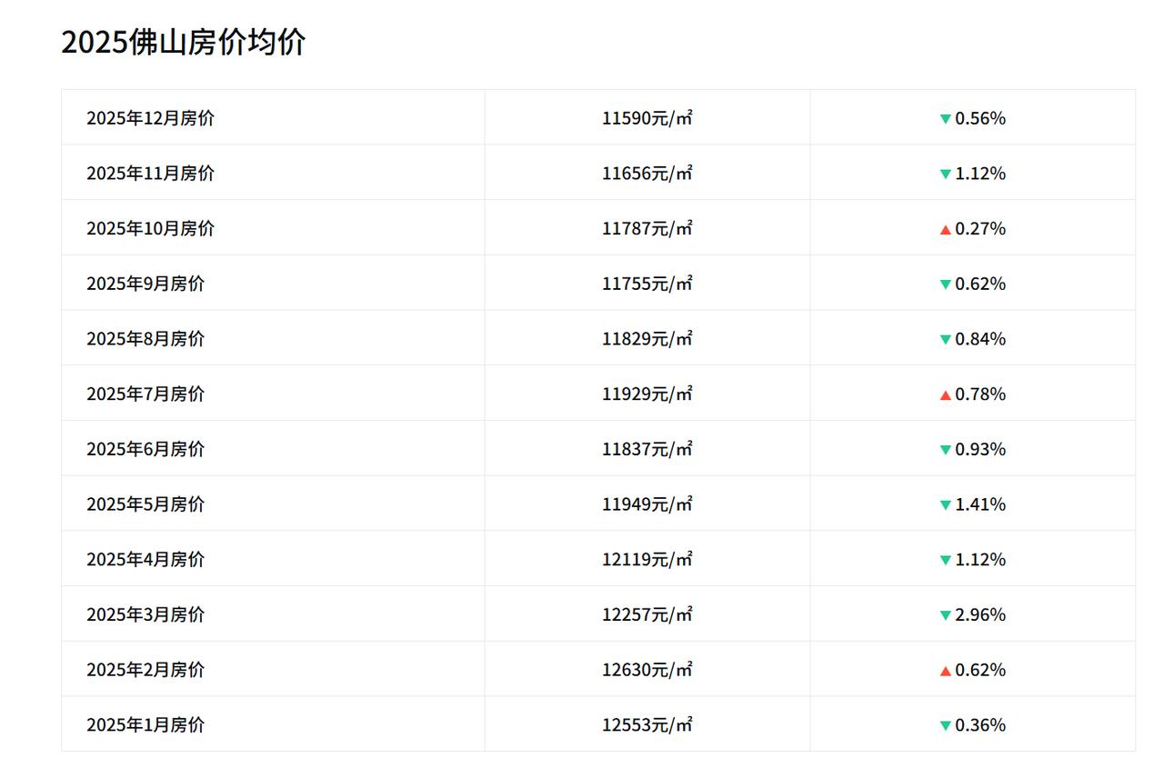 2015年11,佛山房价均价6117元; 2016年11,佛山房价均价6984元; 2017年11,佛山房价均价10231元; 2018年11,佛山房价均价10780元; 2019年11,佛山房价均价12511元; 2020年11,佛山房价均价12893元; 2021年11,佛山房价均价13976元; 2022年11,佛山房价均价14759元; 2023年11,佛山房价均价14746元; 2024年11,佛山房价均价12701元; 2025年11,佛山房价均价11656元。 回顾佛山十年的房价,2025年11月的11656元相比2015年11月的6117元,增长了5539元,涨幅达90.55%。相比2025年1月的12553元,下降了897元,环比2025年10月的11787元,下降了131元。 2025年前三季度,佛山GDP达9620.82亿元,按不变价格计算,同比增长1.6%。其中,第一产业增加值172.31亿元,同比增长4.3%;第二产业增加值4752.11亿元,同比增长1.2%;第三产业增加值4696.40亿元,同比增长1.9%。 截至2024年末,佛山市常住人口969.89万人,其中城镇常住人口 927.64 万人,占常住人口比重(常住人口城镇化率)95.64%。 佛山房价2025年11月比2025年1月下降了897元,下降幅度不小,价格基本上回归到2018年水平。不过也得看区域,核心区域的房价不降反增,远郊地区房价下跌明显,拉低了整体平均价格。 那么,在刚刚过去的11月份,大家对佛山的楼市有什么切身的体会,咱们在评论区聊一聊。 数据说明:以上均价数据,均来自安居客数据,仅作为分析参考,旨在反映佛山近十年的房价走势,不能准确映射当地实际房产价格。因为新房、二手房、不同区域不同位置的房价差别较大,占比也不同,仅通过一个均价不能一概而论。