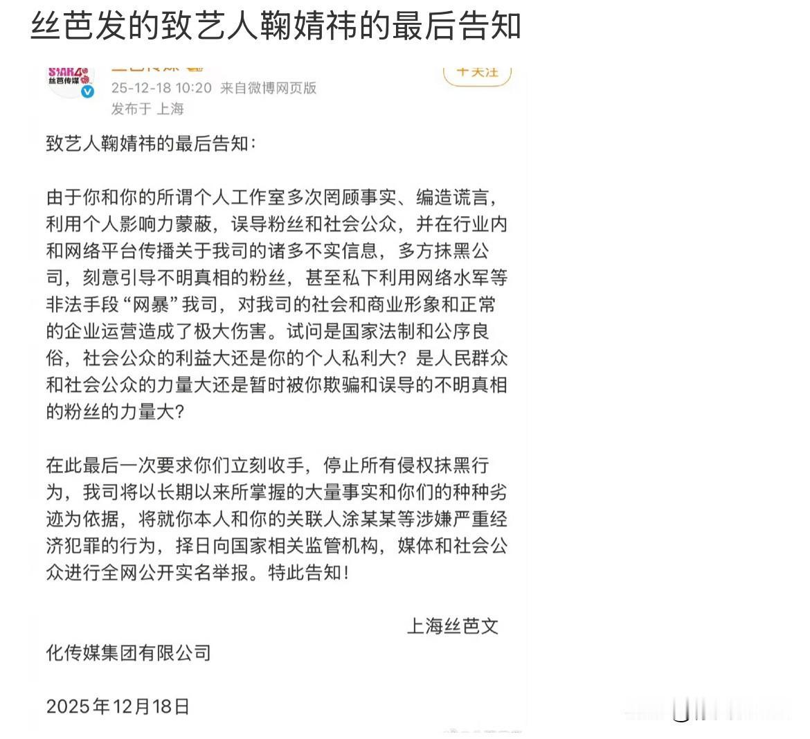 12月18日,鞠婧祎涉及严重经济犯罪行为? 这场博弈还要继续么?希望鞠婧祎服软,又不希望鞠婧祎服软的心情,有谁懂? 他们手里肯定是掌握了一定的证据能一击击溃鞠婧祎防线,鞠婧祎到底要不要继续硬刚 不硬刚就是继续工作8年,硬刚可能没工作了 这场博弈到底要不要争出一个输赢?感觉现在已经没办法喊停了!