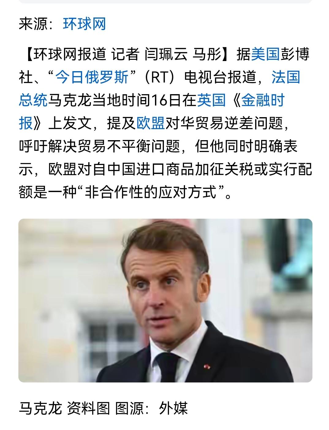 马克龙这一趟中国之行,清醒了不少。 对于双方贸易不平衡,欧盟要对中国商品进行加征关税之际,他认为这是一种“非合作的应对方式”。 想想欧洲现在真的没有什么太多的高科技商品急需中国购买。 双方的贸易形式是不对等的,中国想买欧洲的光刻机,欧洲根本无法自己做主售卖。 包括以前的欧洲军事装备,中国也无法购买。 如今随着中国科技自主能力的加强,欧洲尝到了封锁中国科技的苦果,这是咎由自取,怨不得中国。 如果欧洲真的对中国商品加重关税,中国必将反制,到时候欧洲的经济环境必将雪上加霜。