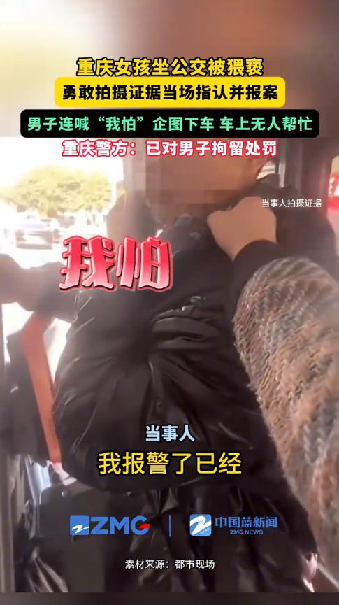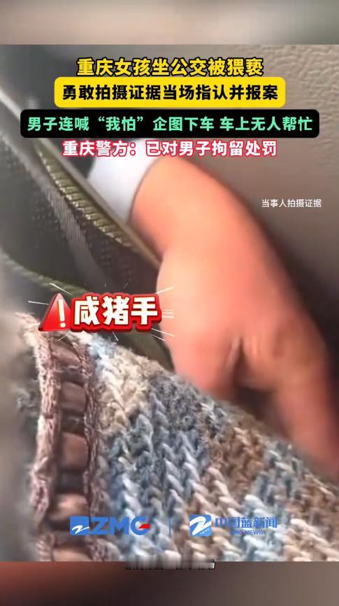 “必须严惩!”11月20日,重庆,一女子坐公交车时,感觉有人在后面摸自己屁股,她赶忙拿出手机录像,随后一把拽住男子的衣领,勇敢的和对方理论!男子见被发现,心虚的道了歉,可女子坚决要报警处理。警方:已拘留! 大家外出时,一定要注意安全,不仅要保管好随身物品,更要小心人群中的“咸猪手”,这种人往往趁着人多的时候下手,女性朋友们一定要多留个心眼。 当天下午,女子有事要外出,便来到站牌等公交车,好不容易等到公交车开后,她便找了个没人的位置坐下。 过了一会儿,就在女子玩手机的时候,突然感觉身后有一只大手在游走,她转动了一下身体,对方快速将手抽了回去,可很快就又伸了过来! 女子意识到对方就是故意的,于是用手机悄悄拍下了证据,随后她起身一把揪起男子衣领,大声地曝光了他的违法行为。 周围的乘客纷纷投来目光,好奇的打量着二人,但是并没有人为女子发声,可女子表现得异常勇敢,她控制住男子并报警,最终将其送去派出所。 民警了解事情经过后,依法对男子做出拘留的处罚,为女子讨回了公道! 大家在遇到类似事情时,一定要勇敢的为自己发声,不然只会助长坏人的嚣张气焰,必须让他们得到应有的惩罚。 信息来源:《重庆女孩坐公交被猥亵,勇敢拍摄证据当场指认并报警,全车无一人帮忙。重庆警方:已对田某拘留处罚。》中国蓝新闻
