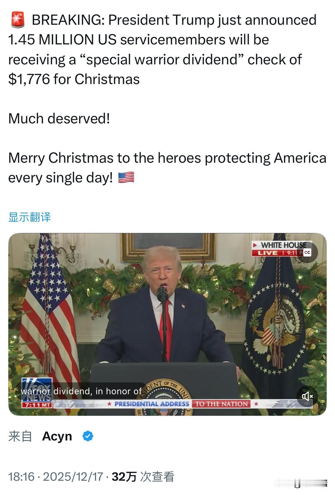 突发新闻:特朗普总统刚刚宣布,145万美国现役军人将在圣诞节期间收到1776美元的“特别战士红利”支票。