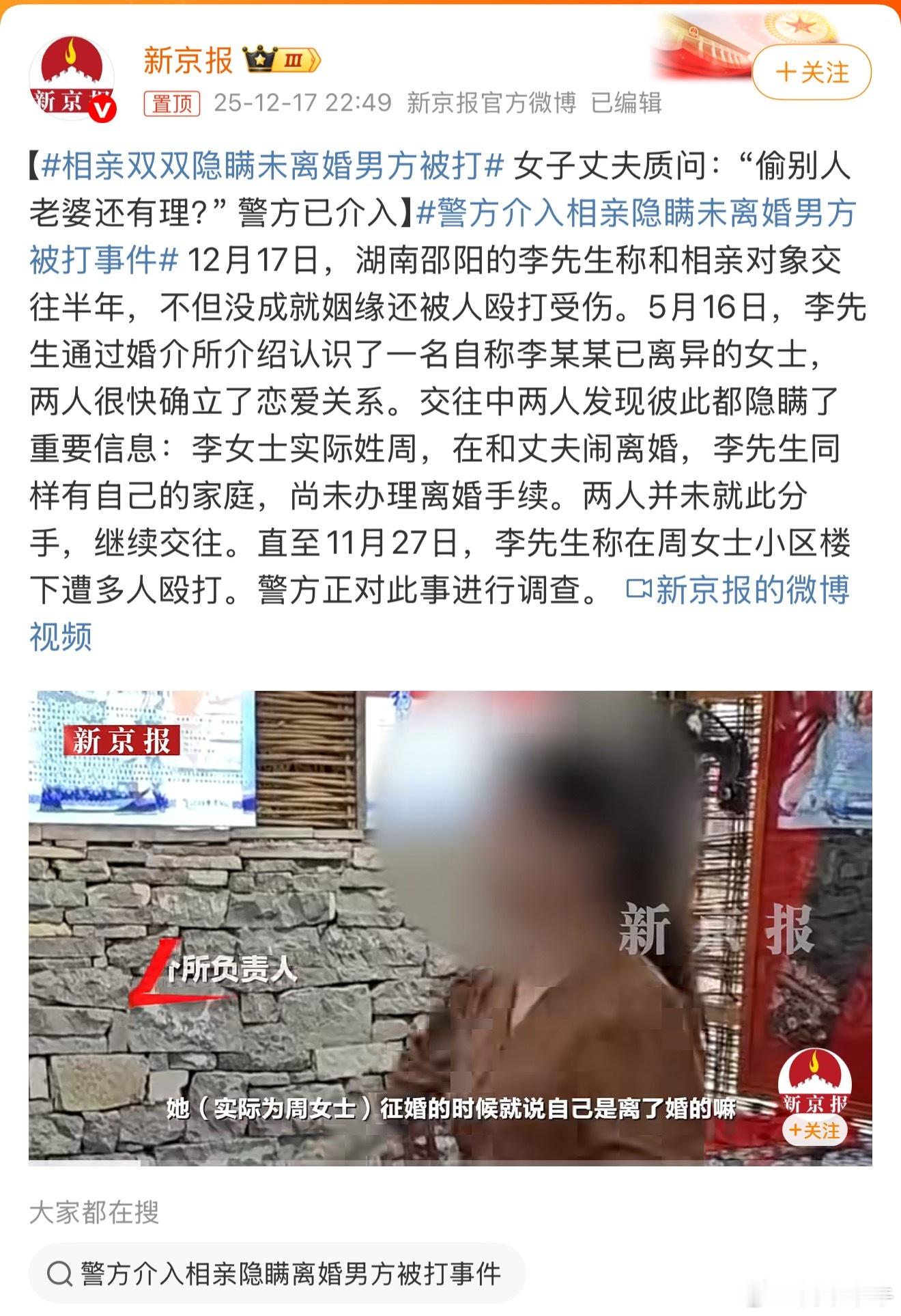 相亲双双隐瞒未离婚男方被打 为什么我感觉这两个人是卧龙凤雏天生一对,半斤和8两就,两人说实话挺般配的,祝他们天长地久就好了警方介入相亲隐瞒未离婚男方被打事件