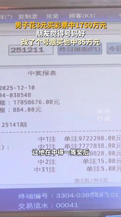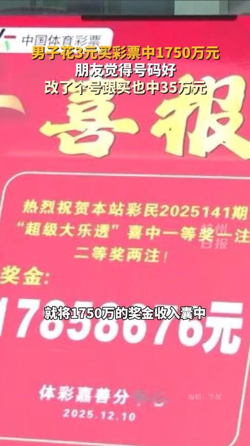 “这简直是捡钱啊!”12月10日,浙江嘉兴,一男子陪着朋友去买彩票,他觉得朋友的号码不错,就改了一位数也买了一张并且加倍,没想到,朋友花3元中了1750万,男子也跟着中了35万!网友:这样的朋友请给我来一打! 不知道大家有没有研究过彩票,凭借几个数字的组合,最终确定大奖,很多人都觉得这其中有规矩,可是钻研十几年却一无所获,其实能不能中奖真的全靠运气。 当天下午,两名男子有说有笑的走进彩票店,和老板寒暄了几句后,其中一人便开始“推算”彩票号码,最终将选中的号码交给了老板,并且还追加了1元的投注。 另一人觉得朋友的号码不错,但是直接跟着买似乎有些不太好,于是就随便改了一个数字,然后又花了2元加倍。 到了晚上,随着彩票中奖号码的公布,守在电视机前的两人变得异常兴奋,因为他们的号码都中了! 男子的号码完全猜中,中了一等奖,总奖金高达1750多万元!而另一人由于改了一个数字,所以中了二等奖,也有35万多元! 老板得知二人中奖后,也是跟着开心,没想到还有这么好的事,自己开店这么多年,也是第一次碰到这种事。 网友看后表示,这运气也是没谁了,要是老板当时也跟着买了一注,那这个彩票站可就出名了! 信息来源:《浙江一男子3元彩票中1750万元,朋友跟买也中了35万元》长江云新闻