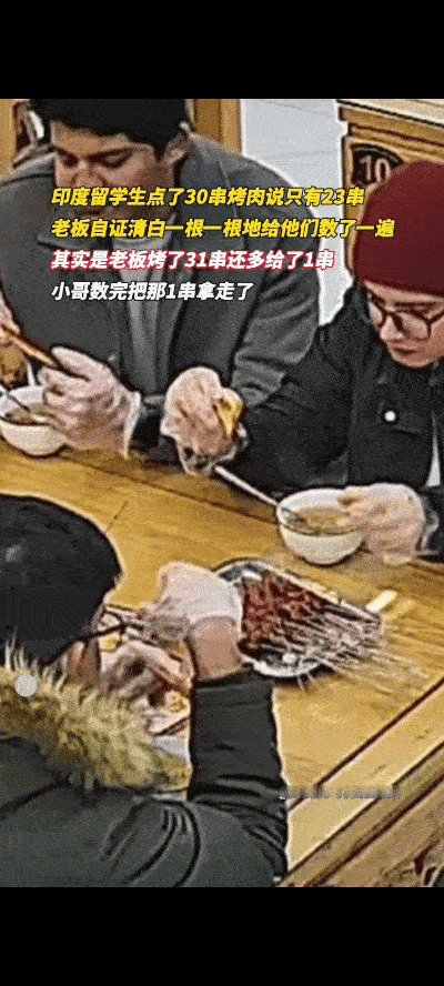 笑死了!西安,4个印度留学生在烧烤店点了30串烤肉,三个馕,还要了4碗免费的高汤。转头就说只收到23串,结果老板开着视频当面数出31串,还把多的那串直接拿走,真的太解气了! 西安的夜市,一到晚上就被炭火和孜然的香气裹住,热闹得很。 一家烧烤店的靠窗位置,四个印度留学生刚坐下没多久,桌上就摆好了几十串烤肉、三个馕,还有四碗他们主动去取的免费高汤。 可还没等动筷子,其中一个留学生突然拍了下桌子,声音瞬间拔高,朝着柜台的方向嚷嚷起来。 他的语气里满是不耐烦,嘴里不停念叨着什么,另外三个同伴也跟着凑过来,你一言我一语地附和,声音越来越大,甚至带着点争执的火气,引得店里其他食客都停下筷子往这边看。 周围人听明白了,他们是在说烤串数量不够,点了30串,现在桌上的顶多只有23串,要求老板赶紧过来处理。 后厨的老板听到吵闹声,擦了擦手上的油就走了出来。 他没跟留学生搭话,也没解释任何情况,只是扫了眼桌上乱糟糟的签子,又看了看吵得满脸通红的几个人,径直掏出手机打开了录像功能,把手机架在旁边的调料台上,镜头正对着桌上的签子。 这里要提一句,这家烧烤店有个不成文的规矩,老板怕每次数签子出错让客人不开心,总会主动多烤一串讨个彩头,这天给这桌留学生上的,其实是31串。 架好手机后,老板没再多耽误,伸手把桌上的签子一根根收拢到自己面前,低下头,手指捏着签子,一根一根地慢慢数了起来。 “31。”最后一个数字落下,老板抬起头,目光扫过那四个留学生。 刚才还在大声嚷嚷的几个人,瞬间没了声音,一个个愣在原地,眼神有点发慌,你看看我,我看看你,脸上的怒气慢慢变成了尴尬。 老板没说任何指责的话,清点完后,直接伸手拿起那串多送的烤串,转身就放回了后厨的灶台边。 可没过几秒,留学生们回过神来,又有点激动了,虽然声音比刚才小了些,但还是带着不满,坚持说自己收到的只有23串,还隐隐透着点老板不讲诚信的意思。 老板站在原地,看了他们一眼,没再理会,转身回了后厨,继续忙活自己的事。 这一幕被旁边桌的食客完整拍了下来,发到网上后,很快就引发了讨论。 不少网友都表示,留学生来到中国,应该尊重当地的规则。 大家觉得,遇到误会的时候,更该先冷静核对事实、好好沟通处理,而不是一味觉得自己被欺负了就吵闹。 还有人提到,中国本就是一个开放包容的国家,不同文化之间的交流从来都不是单方面的接纳,更需要双方的尊重和理解。 这些理性的声音,让原本容易陷入对立的讨论,多了几分平和。 冷静想想,这事未必就是纯粹的算计。 在中国的烧烤摊上,多送一串是老板的心意,是市井里的小人情,可换个文化背景,留学生们可能没理解这份好意,甚至把多送的串排除在了付费范围之外。 而且印度一些地区确实有跳着数数的习惯,两种计数方式撞在一起,误会的苗头早就埋下了。 还有人说,这事要是发生在北上广深,大概率掀不起风浪。 那些城市里,外国人逛街吃饭是常事,大家见得多了,遇到这种小插曲,顶多一笑而过。 值得一提的是,这场风波并没有闹到官方层面,截至12月17日,所有争议都只停留在网上。 说到底,这就是一场小摩擦,但能告诉我们,比争对错更重要的,是互相尊重的规则。 商家可以把多送一串的规矩写在菜单上,少点口头约定的模糊,留学生入乡随俗,遇到不懂的多问一句,遇到纠纷先核对事实,别忙着吵闹。 旁观者也少点标签化的偏见,别把个体行为当成给一个群体贴标签的理由。 夜市的炭火还在滋滋作响,孜然的香气依旧飘在晚风里。 那31根签子的风波,终究会被更热闹的烟火气慢慢盖过。 只希望下次再遇到类似的事,大家都能少点火气,多点耐心。