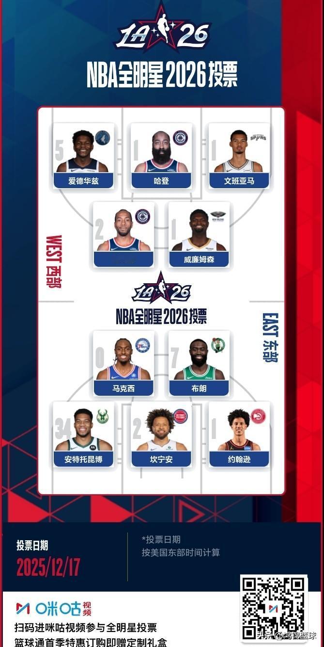 全明星投票今日正式开启,请为哈登投票! 今天是2026洛杉矶全明星赛的首个投票日,请为喜欢的明星投票!哈登的球迷们,展现你们的支持力度吧!我选择的西部全明星为:哈登、爱德华兹、小卡、锡安和文班亚马;东部全明星为坎宁安、马克西、布朗、凯伦约翰逊和字母哥!其中文班亚马、坎宁安、马克西、布朗和凯伦约翰逊是因为表现出色。小卡是哈登现队友,爱德华兹和字母哥是哈登后面可能的队友!这就是真哈登粉!