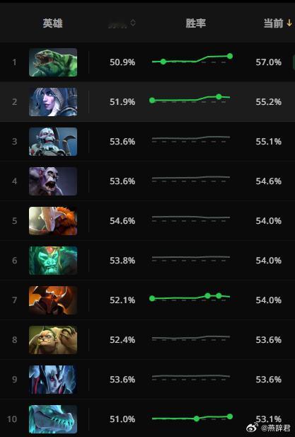 新版本更新两天了,看看胜率前10的英雄!小黑居然冲到了胜率第二!瓜皮胜率登顶了!dota2