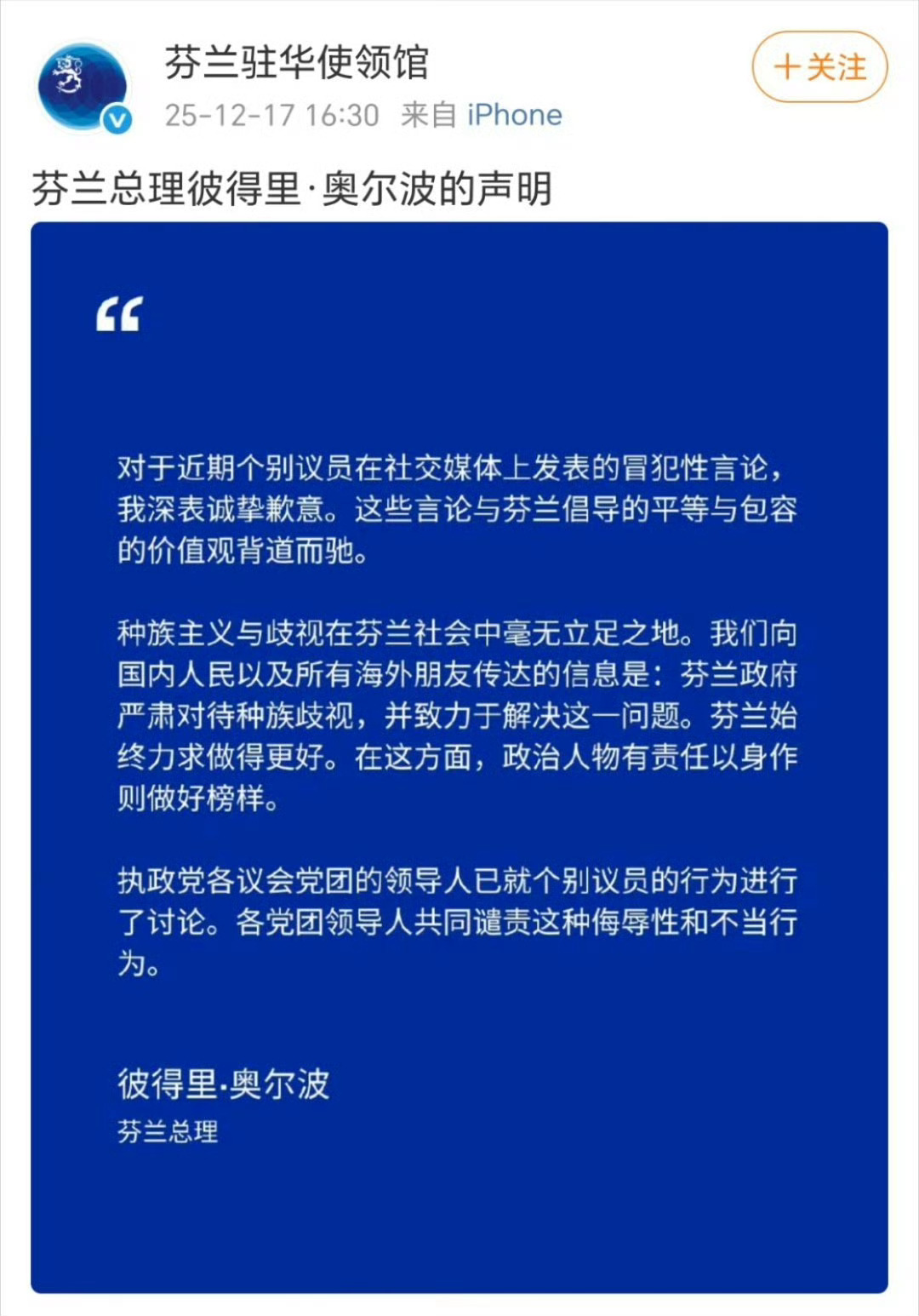 芬兰总理正式道歉道歉了。