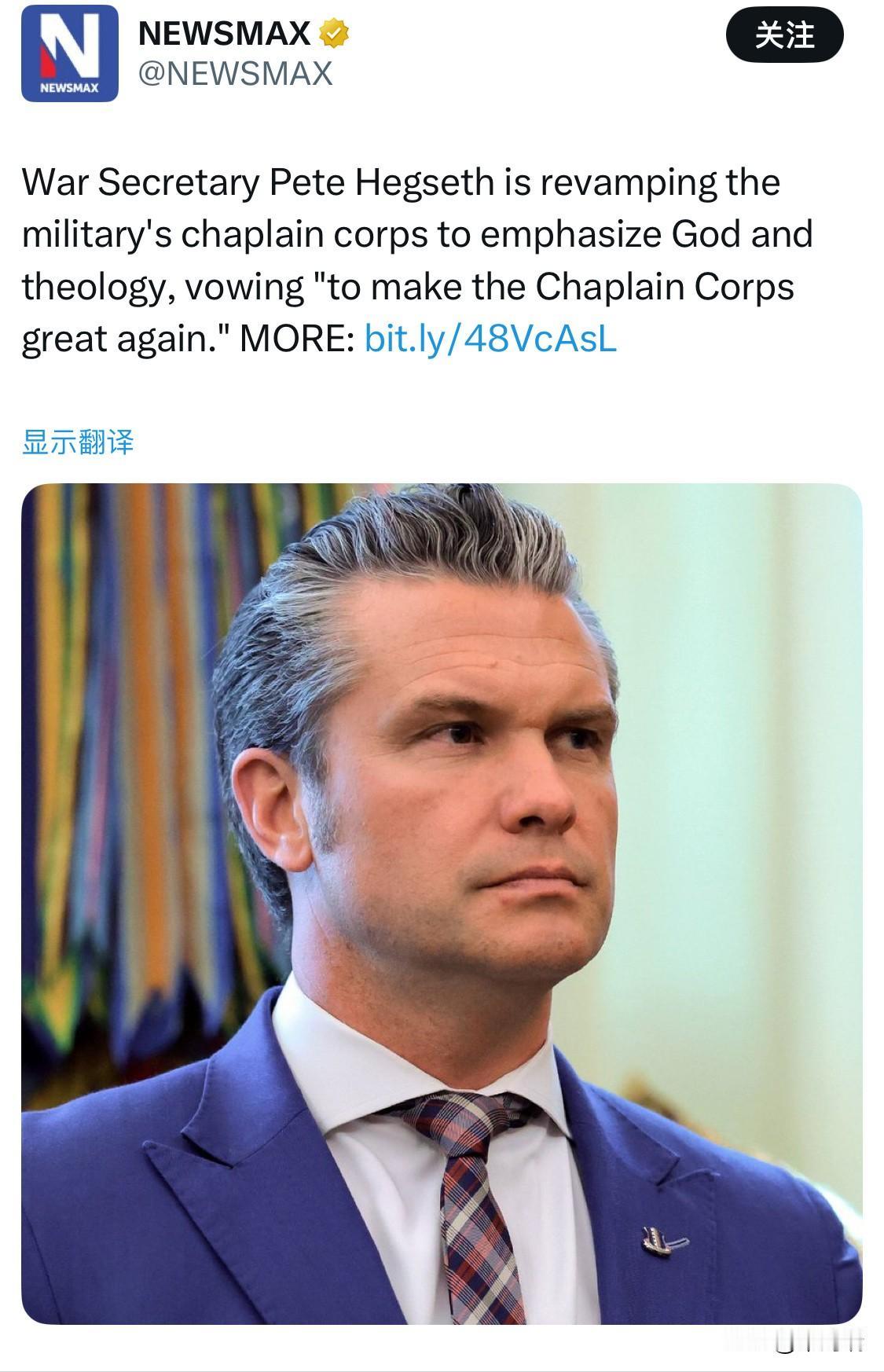 美国战争部部长皮特·赫格塞斯 (Pete Hegseth)宣布,美国将重建随军牧师团,“在政治正确和世俗人文主义的氛围下,随军牧师的作用被边缘化了。我们将恢复随军牧师作为我们战斗部队的道德支柱。”