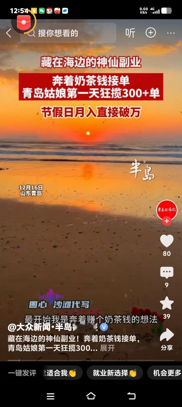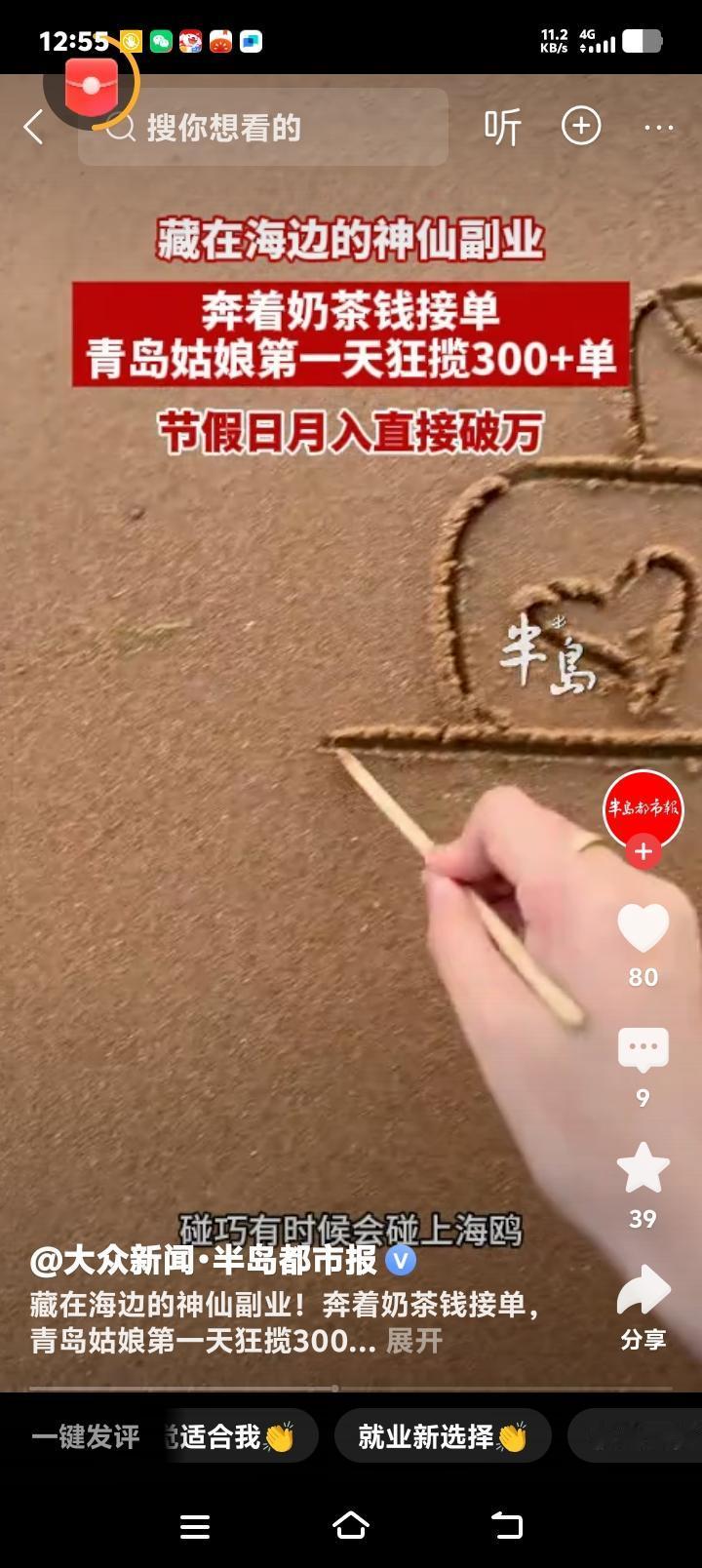 青岛栈桥海边惊现“愿望魔法师”!95后姑娘一根木棍日接300单,月入轻松破万,背后故事让百万打工人破防:这才是生活该有的样子! 当你在写字楼里对着PPT绞尽脑汁时,青岛姑娘小渔正光着脚丫,踩在栈桥边被夕阳晒得温热的沙滩上。海鸥掠过她的头顶,她只是弯腰,用一根随手拾起的木棍,在金色的沙面上为千里之外的陌生人,画下一个心形,或写下一句“生日快乐”。你或许难以置信,这个始于“赚杯奶茶钱”的念头,让她在开张第一天就爆单300+,节假日收入直接冲上五位数。这不是虚构的剧本,这是正在青岛海滨真实上演的“浪漫生产力”。 小渔的沙滩代写故事,始于一次偶然。她本想只是记录自己的生活,随手帮朋友写了一句祝福发到网上,却意外收到了雪片般的私信:“能帮我写一句吗?”“可以定制吗?”从最初的免费帮忙,到五元、十元一单,再到如今复杂的艺术字和场景定制,她手中的木棍,仿佛成了一根连接人心与海洋的魔法棒。 有人会嗤之以鼻:在沙子上划拉几下也能赚钱?但如果你听过那位北漂青年,收到写有“妈,我今年回家”的沙滩照片时,在电话那头的长久沉默;如果你看过那位妻子为援疆丈夫定制的“等你归来”四个字后附上的留言:“他说,看到海就像看到了家的方向”——你就会懂得,他们支付的,从来不是书写的劳务,而是一份无法亲自抵达的“情感抵达”。 这门生意最温暖的内核,在于它成为了现代人情感的“临时寄存处”。一个独自在青岛打拼的女孩,每年生日都找小渔写同一句话:“祝我勇敢。”她说,这是她给自己不变的仪式。一位不善言辞的父亲,偷偷预定孩子百天的沙画祝福,留言写道:“爸爸的爱,像海一样深,但爸爸嘴笨。”潮水会带走沙上的字迹,但那份被郑重其事委托和接收的心意,却永远留在了某个人的生命瞬间里。 当然,质疑从未缺席。“不务正业”“这钱太好赚了”的声音时有耳闻。然而,更多困在格子间里的年轻人,却从中窥见了一种新的生活图景:原来收入不一定与钉钉打卡绑定,原来创造价值的方式可以如此自由而富有诗意。当“内卷”成为职场常态,这些散落在海岸线上的小小事业,正重新定义着“工作”与“生活”的边界。 值得深思的是当代人的消费转向。为何人们愿意为几分钟后便消失的“沙书”付费?或许,正因为这是一个数字信息爆炸、一切表达都趋于速食和复制的时代。当关怀沦为微信群发的模板,一份带着真实海浪声、有着阳光温度和沙粒质感的手写祝福,便成了对抗冷漠与虚拟的、最具象的温暖抵抗。 这个行当也在悄然升级。从小渔一个人,到吸引来美术生搭档设计字体,摄影爱好者提供专业跟拍,甚至衍生出“日出许愿”“海鸥衔信”等创意玩法。一片普通的沙滩,正在变成年轻人轻资产创业的试验田。它门槛极低,却要求极高:不是写字的技术,而是共情的能力。 有观察者一针见血地指出:“她贩卖的哪里是字?分明是都市人集体匮乏的‘仪式感’和‘专注力’。我们习惯于用红包数字衡量情谊,却忘了如何郑重地表达。于是,有人巧妙地将地理场景转化为情感服务——客户购买的,其实是那个愿意在黄昏海风中,为你一笔一画、专注祈愿的片刻真诚。这种‘可触摸的仪式’,精准治愈了屏幕时代的表达无力症。” 这些沿海的年轻人,不知不觉成了城市情感的“摆渡人”。当内陆的粉丝想为偶像送上生日祝福时,是他们让这份心意“落地”于山海之间;当异国恋的情侣思念蔓延时,是他们用最原始的方式,画下跨越时空的同心圆。他们不仅是书写者,更是这个快节奏时代里,为数不多的“慢递员”。 海浪日复一日地抚平沙滩,如同生活总会覆盖昨日的悲欢。但那些曾被郑重写下的名字、愿望和爱意,就像沙滩上闪亮的贝壳,虽被卷走,却确凿地存在过。明天,下一波潮水又会送来谁的故事呢?或许,每个人心里都有一片海,等着被一句真诚的话轻轻点亮。 小众轻资产创业情感疗愈 生活哲学 来源:洵哥根据半岛都市报《藏在海边的神仙副业!奔着奶茶钱接单,青岛姑娘第一天狂揽300+单》、新京报“硬壳INK”系列报道及小红书、抖音等社交平台真实案例综合撰写)