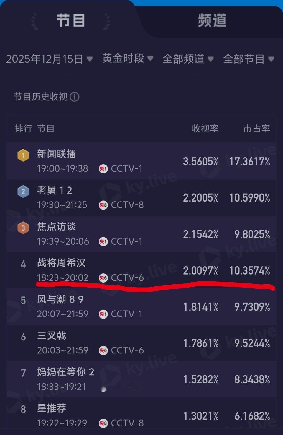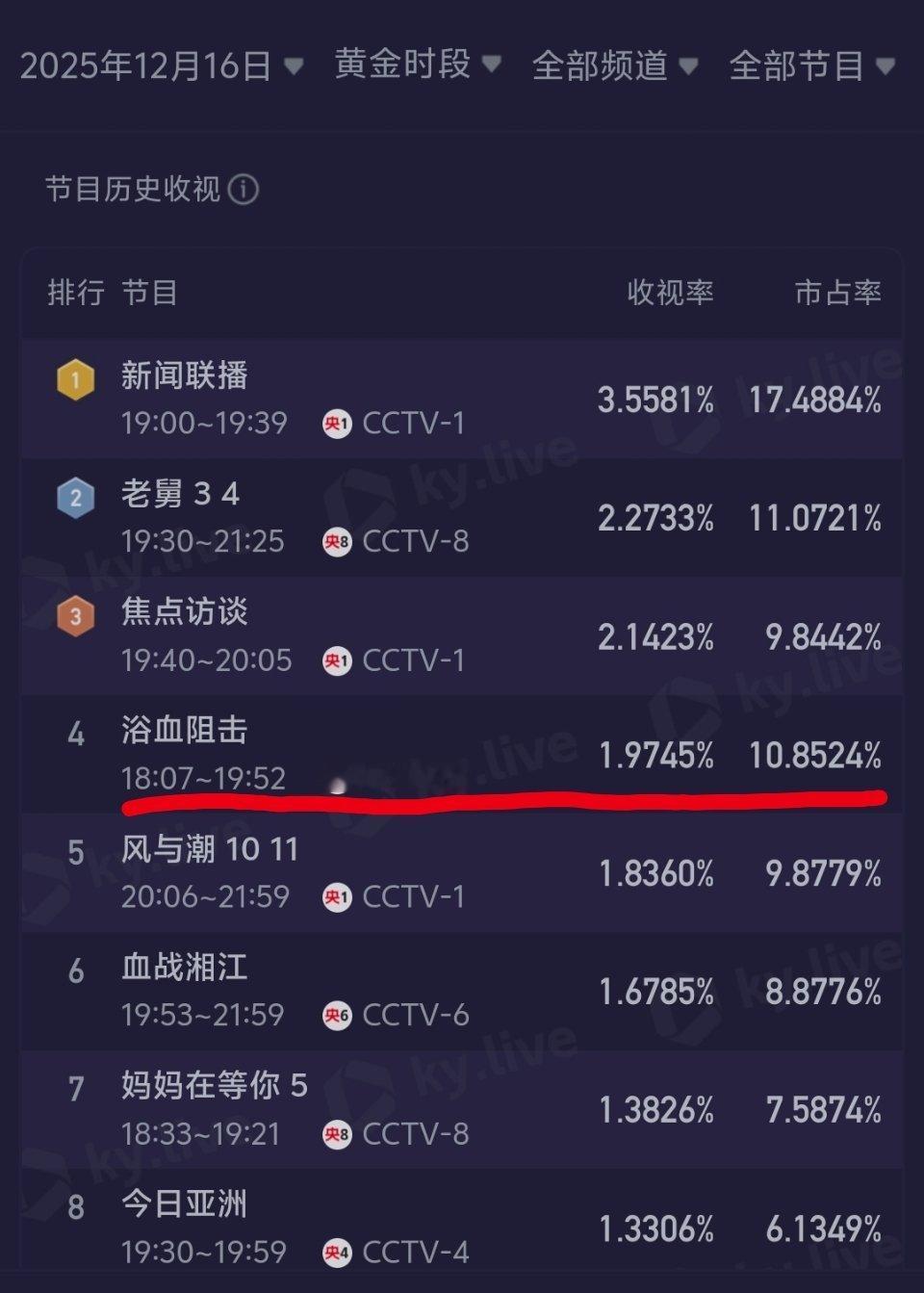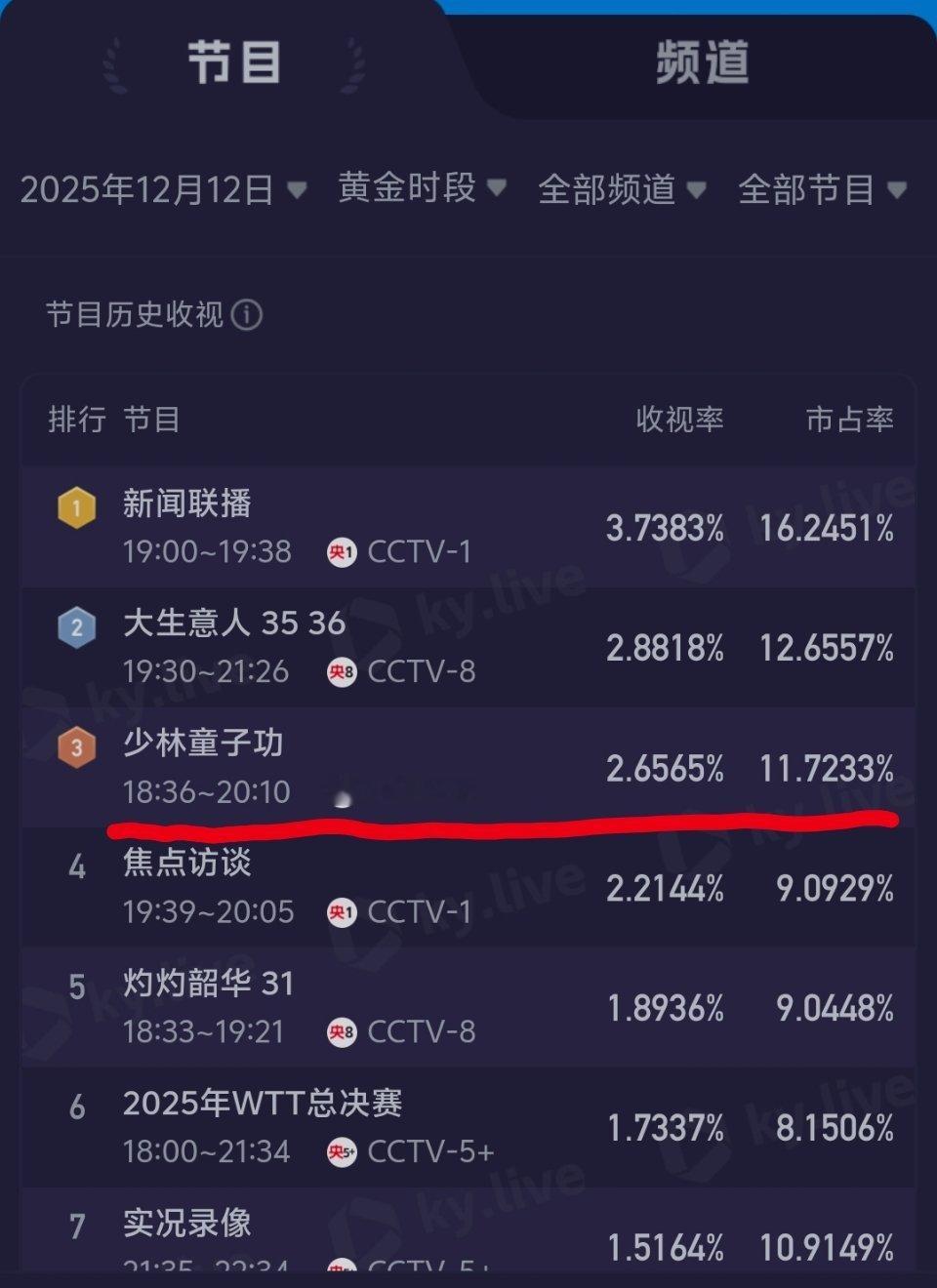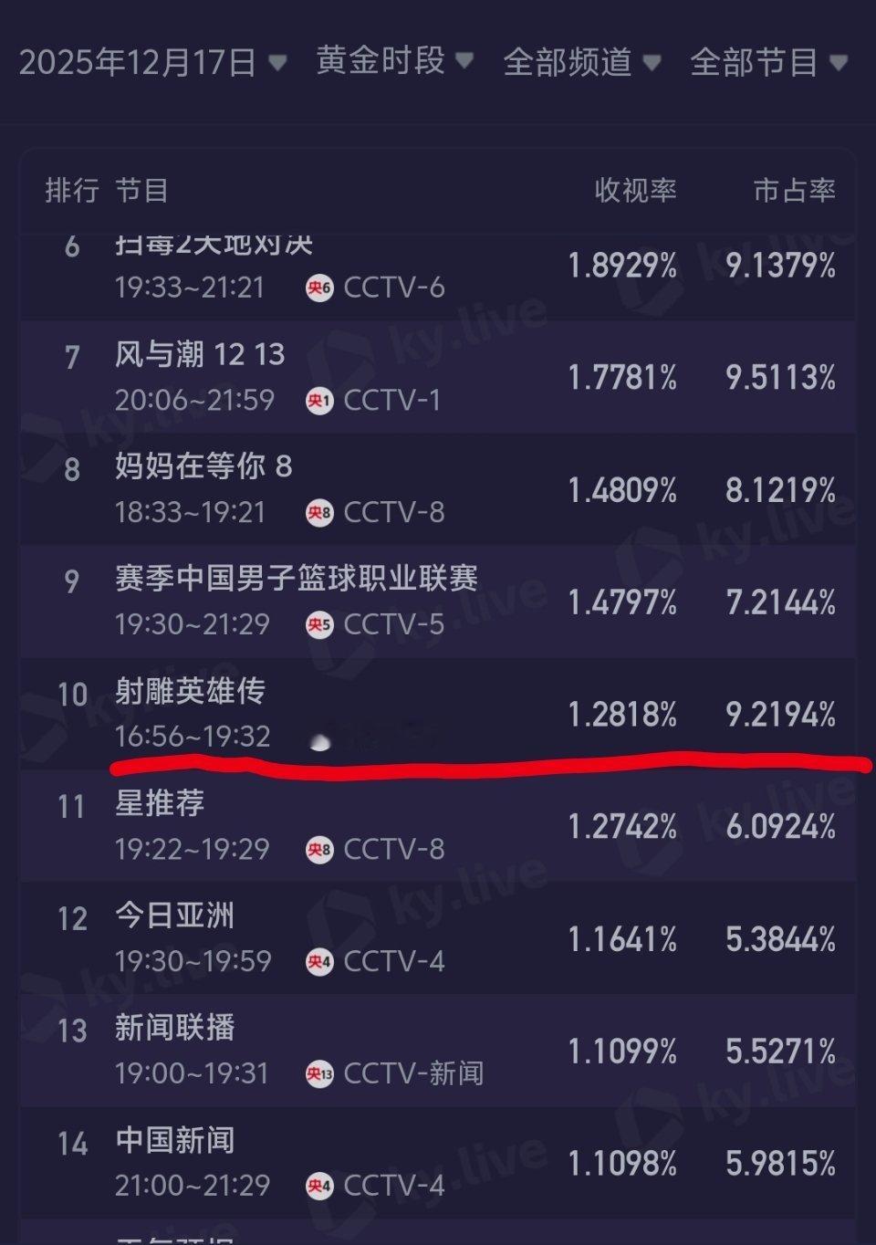 又开始虚假营销了,忽悠不明真相的大众。我查了数据,射雕英雄传实际收视率是1.28,所谓破2只是实时,拿实时数据却又不注明实时,是在混淆视听污染信息流。论实时数据,央六播出的电影哪部没有实时破2呢?这是底线好吧?对比一下央六前几天的电影,浴血狙击平均收视率都有1.97,战将周希汉2.0,淮海战役2.1,少林童子功2.6,这些可都是平均收视率,不是实时哦。射雕都成收视洼地了,好意思拿出来宣传?还原真相,以正视听。