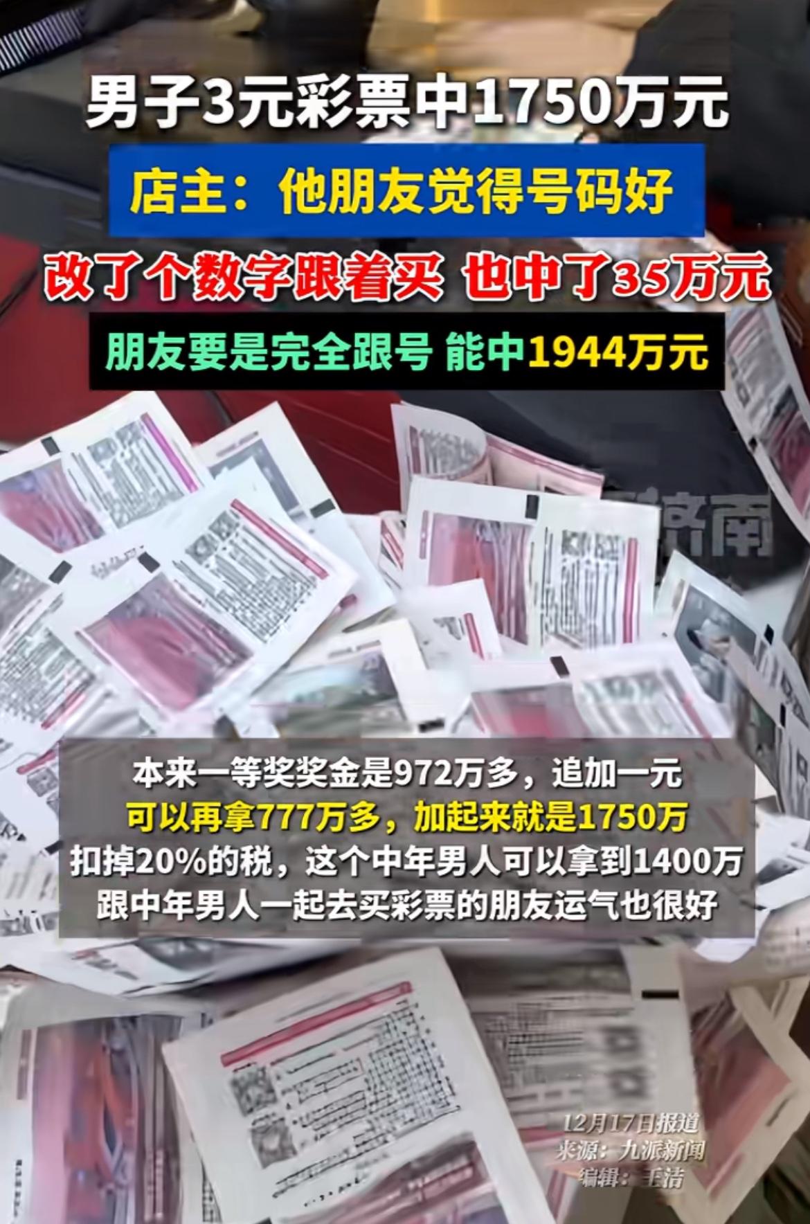 彩票这东西,有时候真的让人又爱又恨啊!浙江嘉善有个中年彩民,花3元买了张体彩大乐透单式追加票,直接中了1750万,这运气简直逆天了。他就多花1元追加,在972万基本奖金基础上,又多拿777万浮动奖金,扣税到手1400万。 更有意思的是,他同行的朋友,觉得号码不错,改了一个数字花4元买,中了两注二等奖,拿了35万。要是这朋友完全跟号,奖金超1944万呢。不过彩票就是公益娱乐,大家还是得量力而行,可别沉迷,不然就像这朋友,改个数字就与巨额奖金擦肩而过啦。