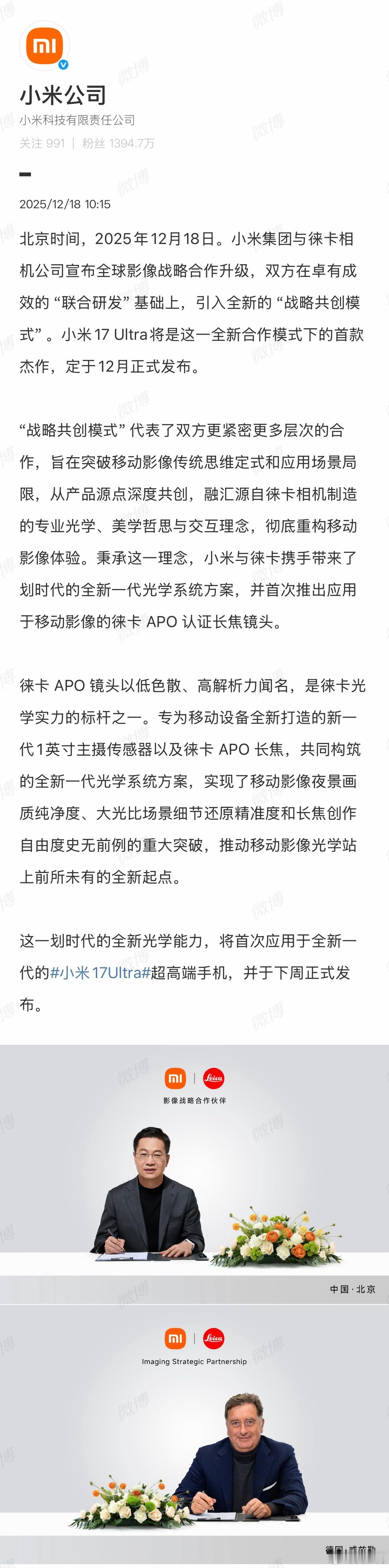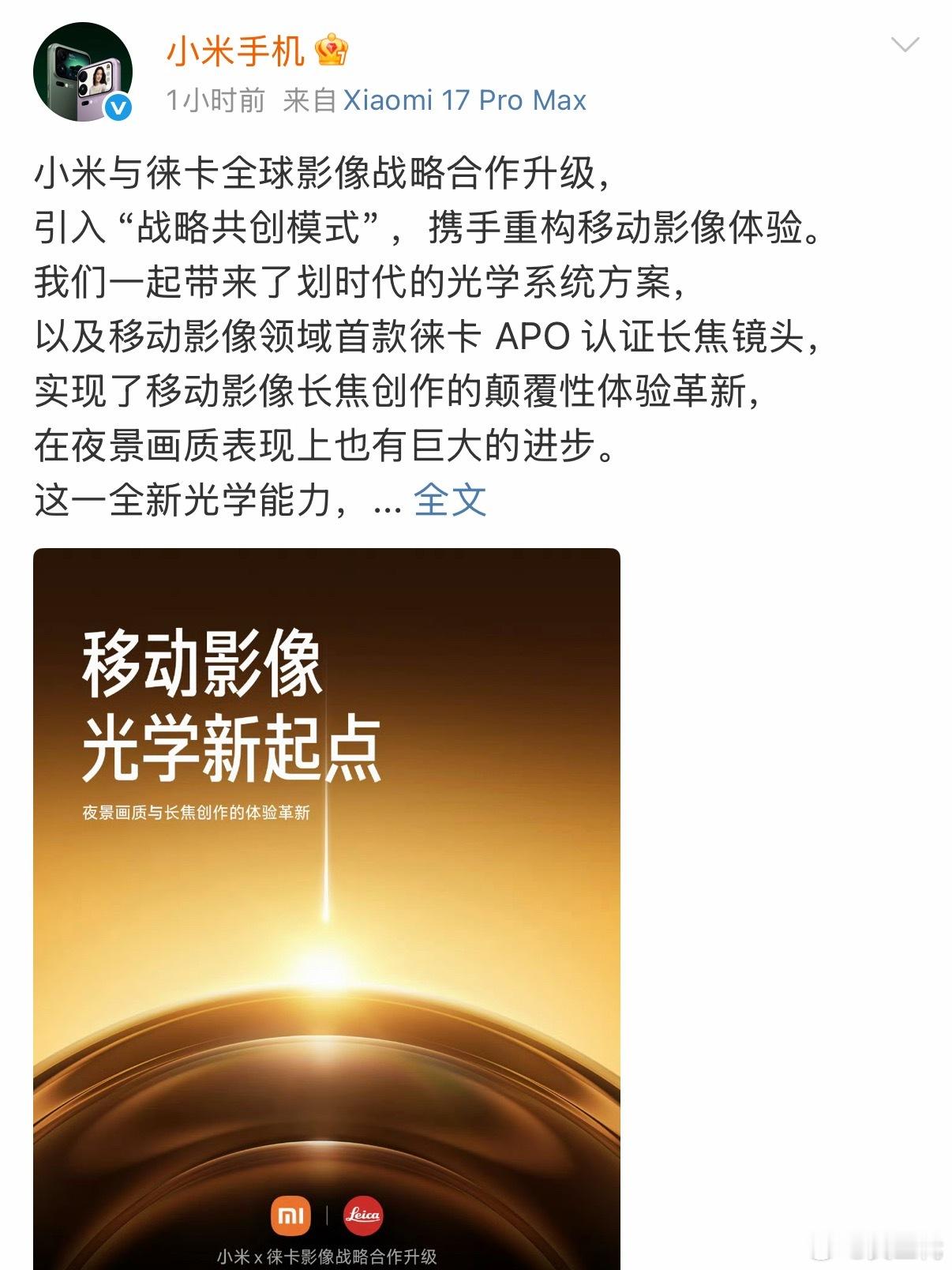 小米17Ultra发布时间定档小米17 Ultra下周见!我给你们翻译翻译这几句话是什么意思,小米和徕卡的合作再次升级,17 Ultra会搭载新一代1英寸主摄和徕卡2亿APO长焦,可能是26年唯一硬件配置这么强的,目前市面上还没有这样的手机还有移动影像长焦创作的颠覆性体验革新,我唯一能想到的就是连续光变,恐怕要领先友商一个身位了,真能在手机端实现吗?