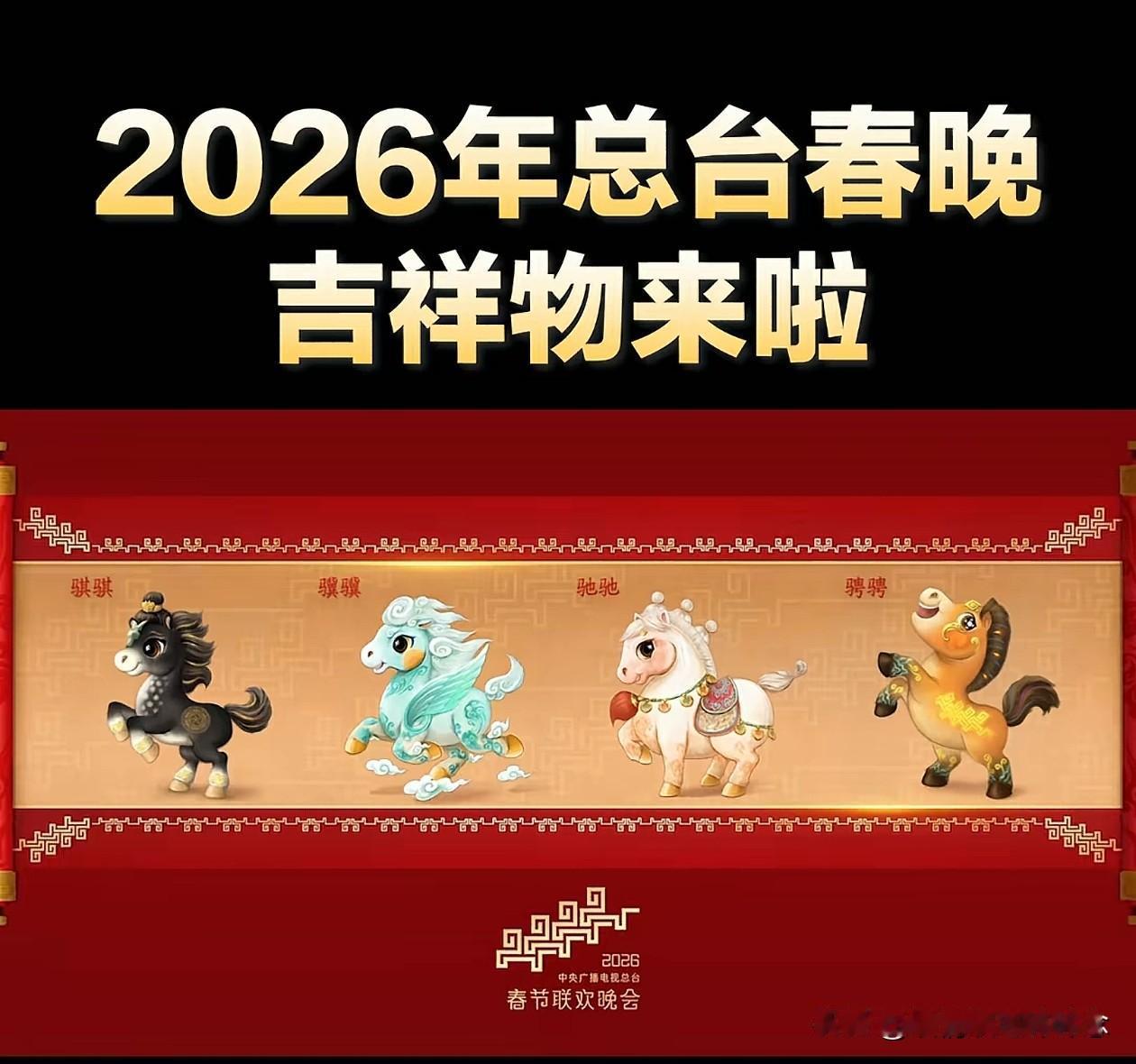 2026央视春晚吉祥物来了, 四匹骏马齐亮相, 它们的名字象征着:卓越的才能、昂扬的斗志、开阔的舞台与光明的未来。 这四匹马分别叫骐骐,骥骥,驰驰,骋骋。骐骥驰骋寓意施展才华、大展宏图。古语有“老骥伏枥,志在千里”,“骐骥一跃,不能十步;驽马十驾,功在不舍。”饱含了祝福与期许,励志与自勉。 希望大家都能在2026年“骐骥驰骋,势不可挡!”
