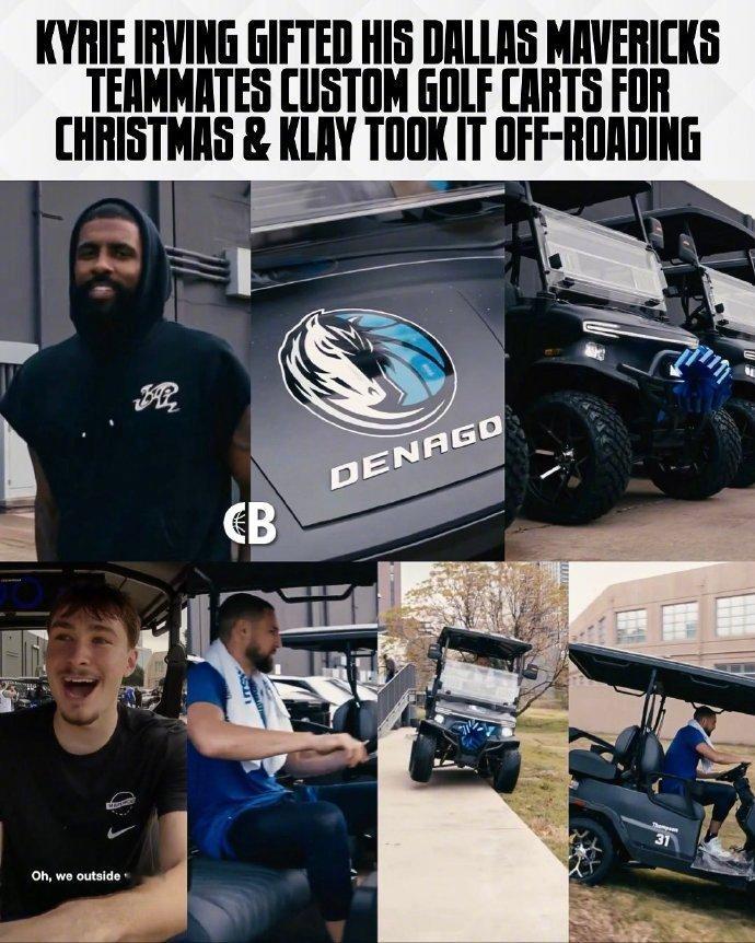 欧文送队友高尔夫球车圣诞节将至,昨天东契奇送给湖人全员103辆电动自行车,今日欧文也为独行侠队友送上高尔夫球车。