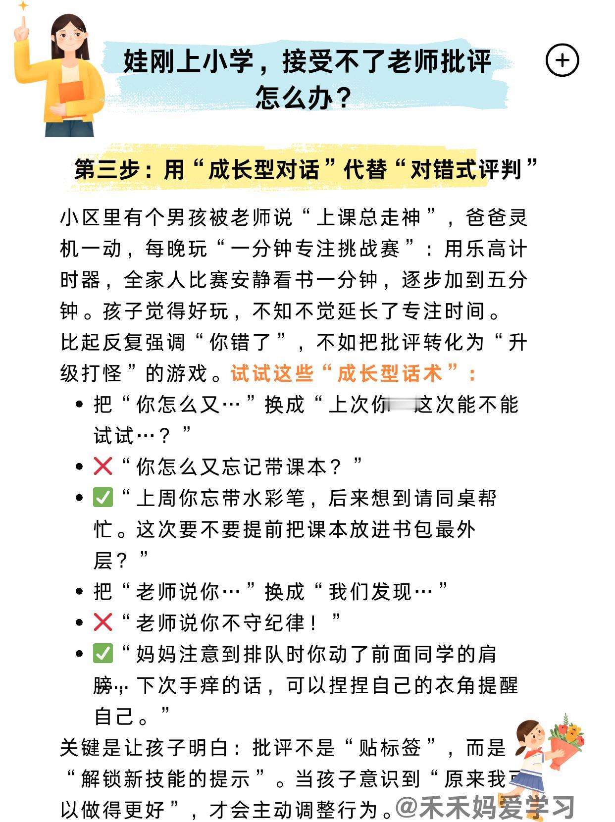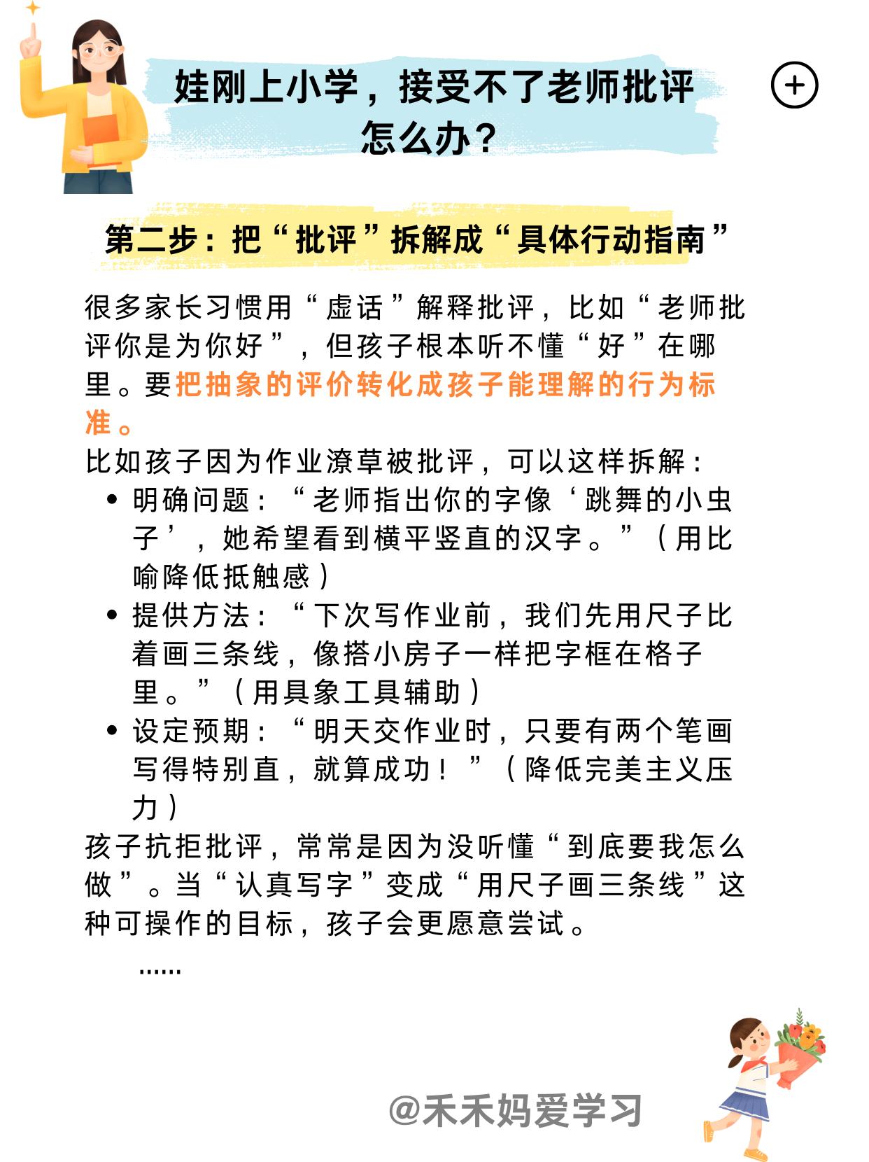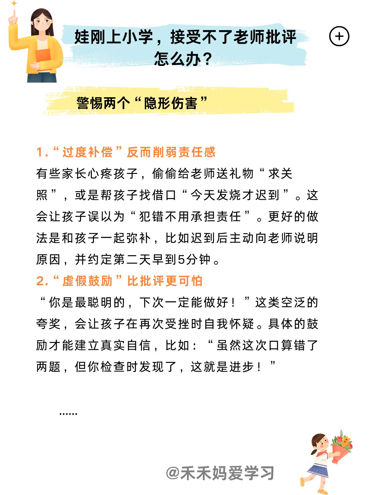 幼儿园里,老师都很少批评孩子,即使他们犯了错,老师也是一口一个宝贝的“哄着”。 可是小学就不同了,小学是正式教育的初始阶段。老师的主要任务是教学,也不是照看孩子,所以孩子犯错时,老师难免会批评孩子,如果孩子脸皮薄,玻璃心,就很难接受这种批评,甚至因此哭鼻子、不想去上学。 遇到这种情况,一般家长要么各种哄骗,要么给孩子讲道理,说老师凶你是为你好,但效果却很一般,甚至会使情况更严重。 孩子接受不了老师的批评,家长该怎么办? 教育学家蒙台梭利曾说:“儿童对批评的反应,折射出他对世界的基本认知。” 那些被批评后能快速恢复的孩子,并非天生“皮实”,而是早早就建立了这样的认知:批评不是终点,而是改进的起点;犯错不可怕,重要的是找到下一步的行动方案。 如果你不知道如何处理类似事件,下图我给大家整理了遇到这种情况的处理办法,建议各位家有低年级小学生的父母认真读一读,抓住3个关键点,或许就能将这种情况,变成帮孩子成长的机会。