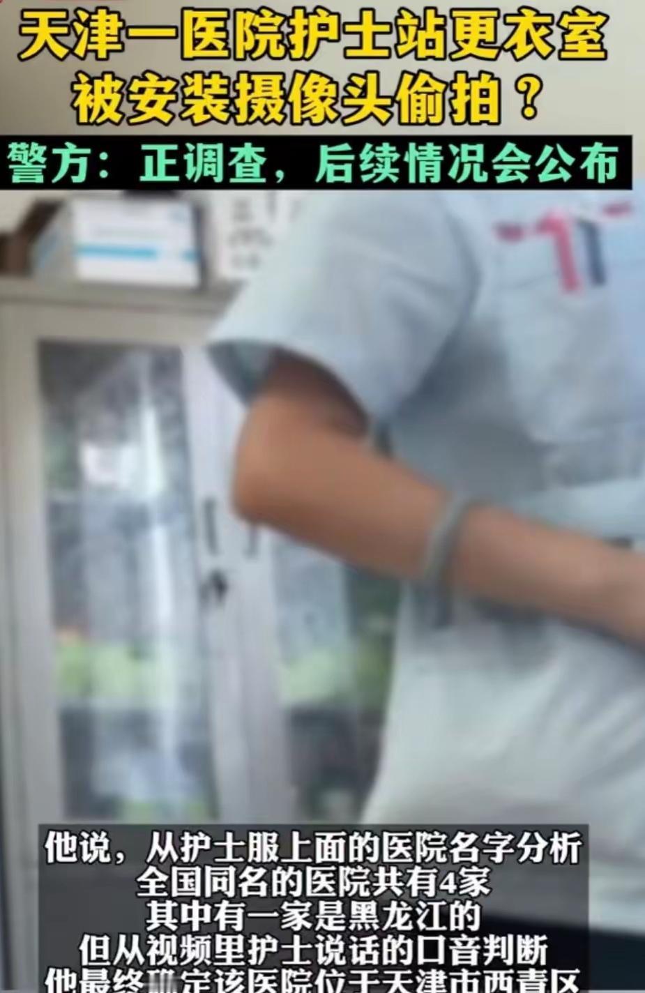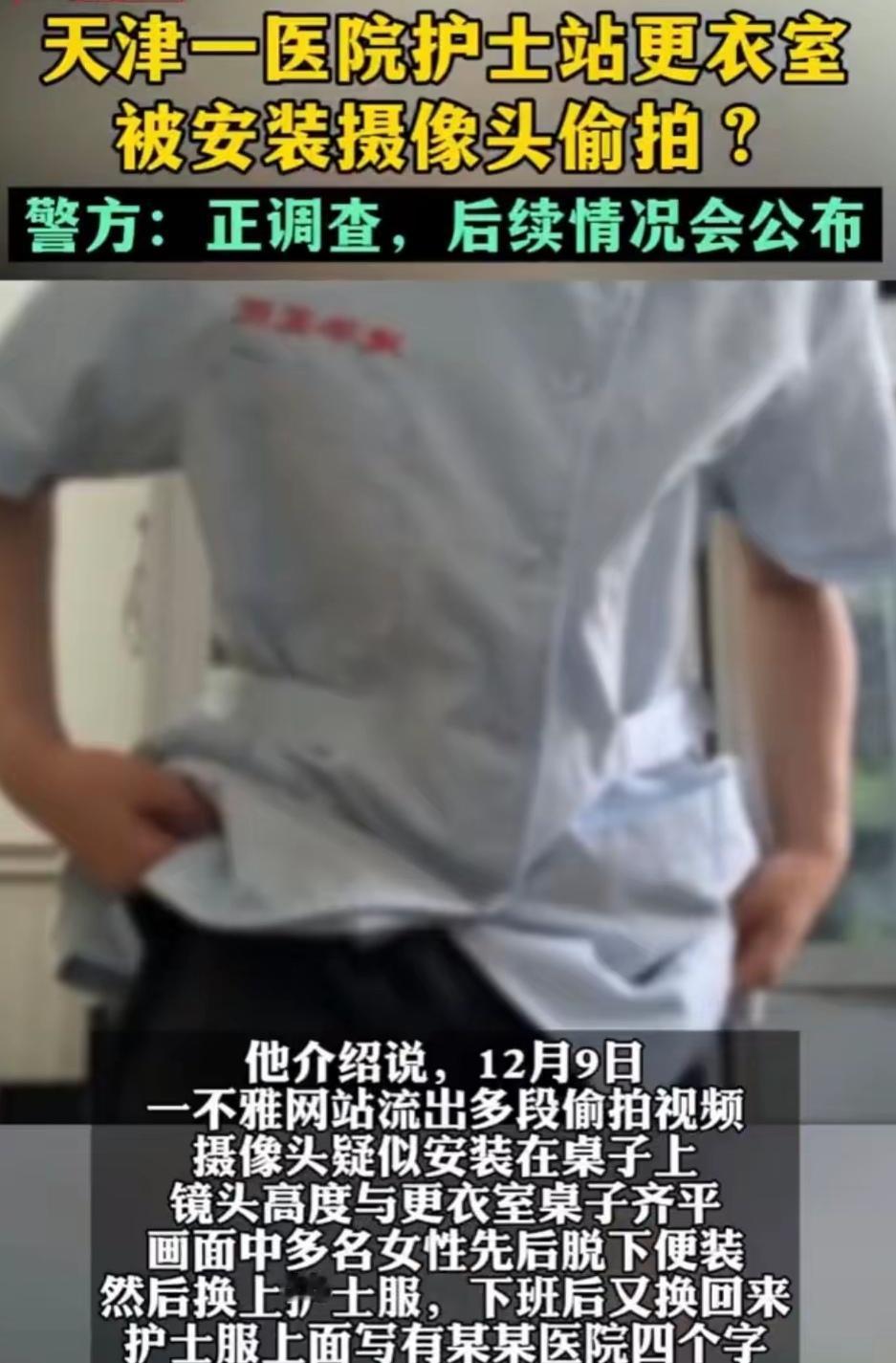 细思极恐!医院护士更衣室被偷拍! 12月9日的时候就看到过这个举报视频, 有个网友发视频说,有段长达30分钟无剪辑医院护士换装视频流出,后来不知道什么缘故下架了。 今天该网友又把视频发了出来,说视频被举报下架了三次,原因是不适宜公开,从视频上传日期看,是4个星期前,也就是11月9日前后。 从视频拍摄角度看疑似偷拍,有多名女护士脱下便装换上工作服的画面,该网友看到了护士服上医院名称为“建华医院”。 再结合视频中护士说话的口音,推断视频拍摄于天津市西青区一家医院,网上搜了下,天津“建华医院”确实在西青区有一家分院。 该医院是一家私立医院,主攻的是精神专科,设有普通精神科、康复科、老年精神科和心理门诊。 该网友已经向当地派出所报了警,当前还未找到始作俑者,像医院更衣室这种场所外人不让进,大概率是内部人员。 当前事情过去了近一个月,不知道最后的结果会是什么样,偷拍违法成本太低,给了不法分子可乘之机。 现在的针孔摄像头越来越隐蔽,像酒店,商场的试衣间,洗手间,医院等地方,多是偷拍的场所,大家出门一定要注意个人隐私安全。 医院不雅事件 医院暗拍事件